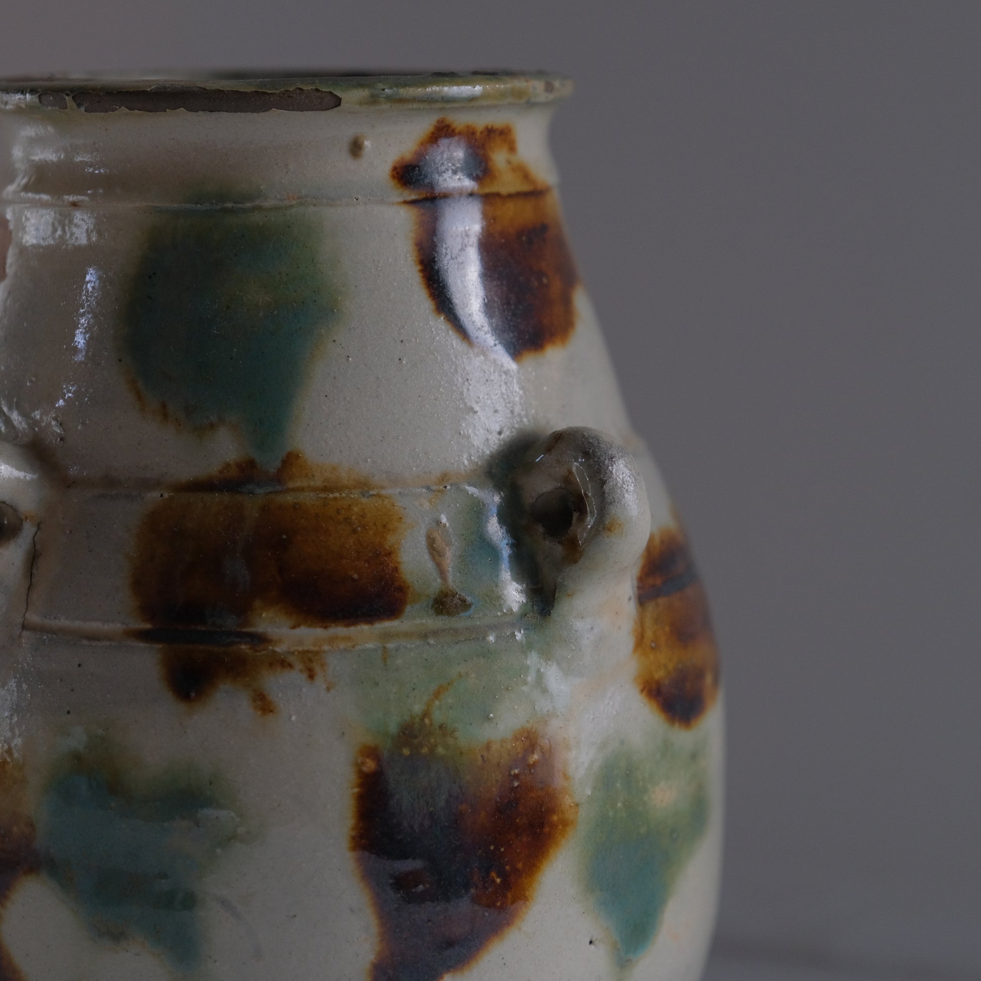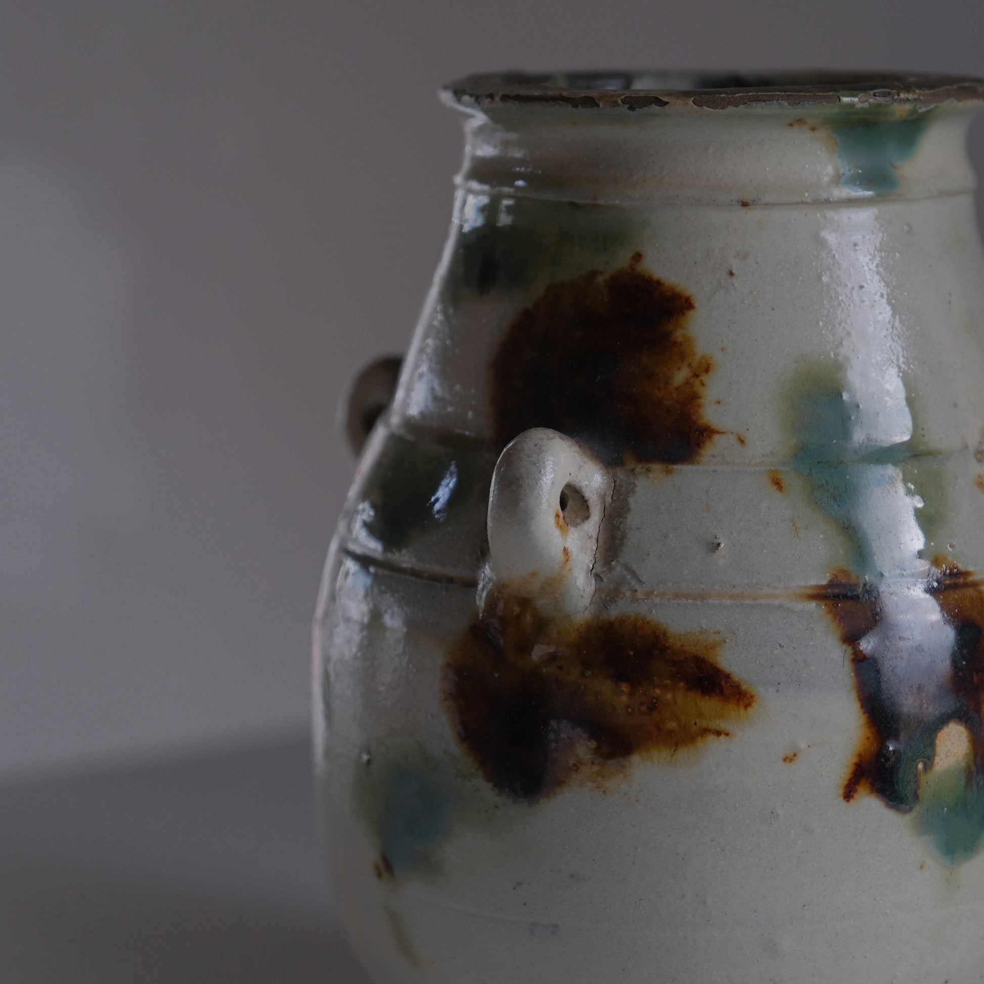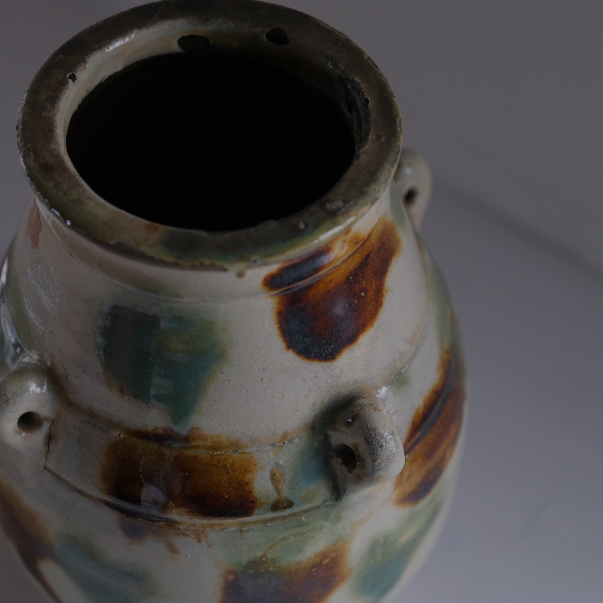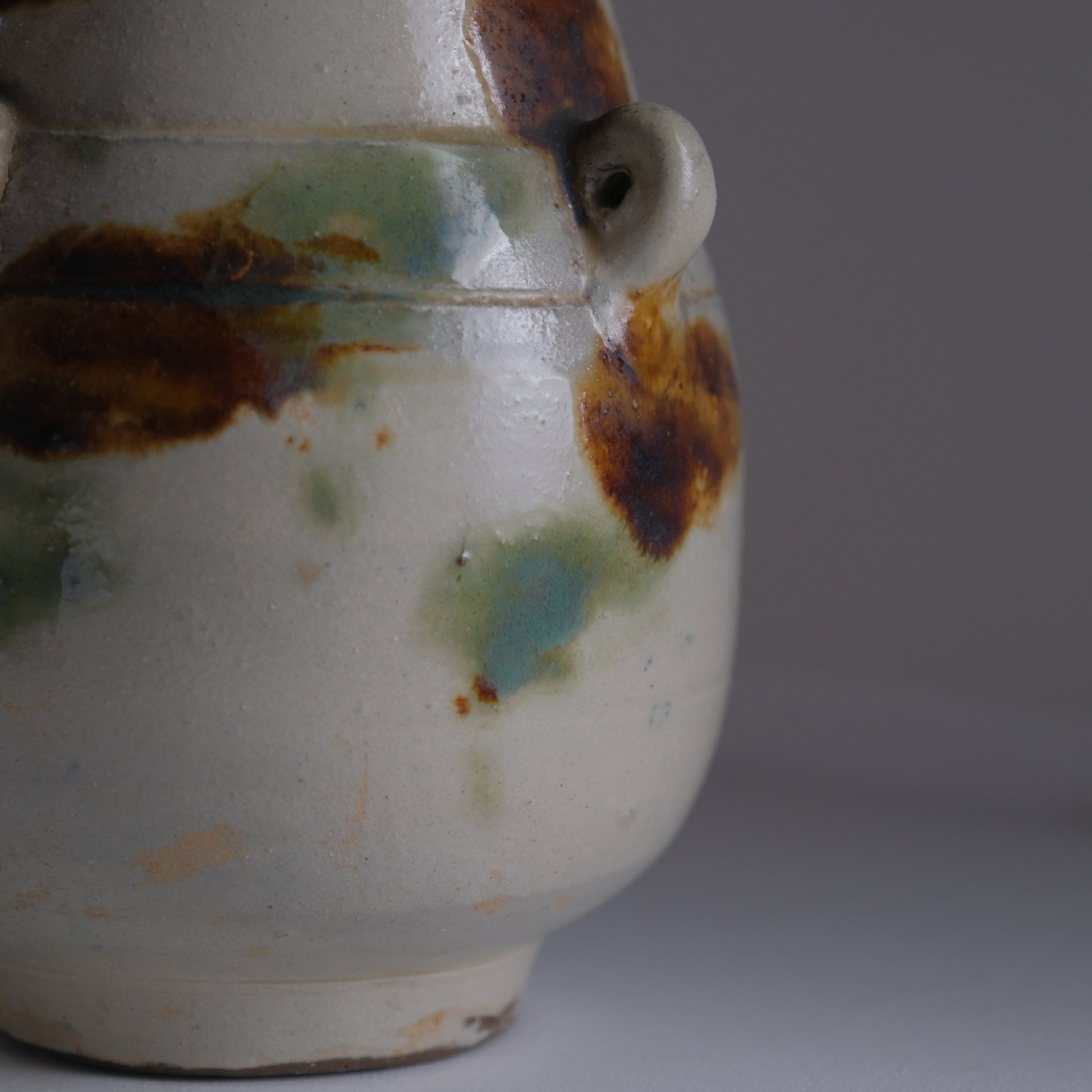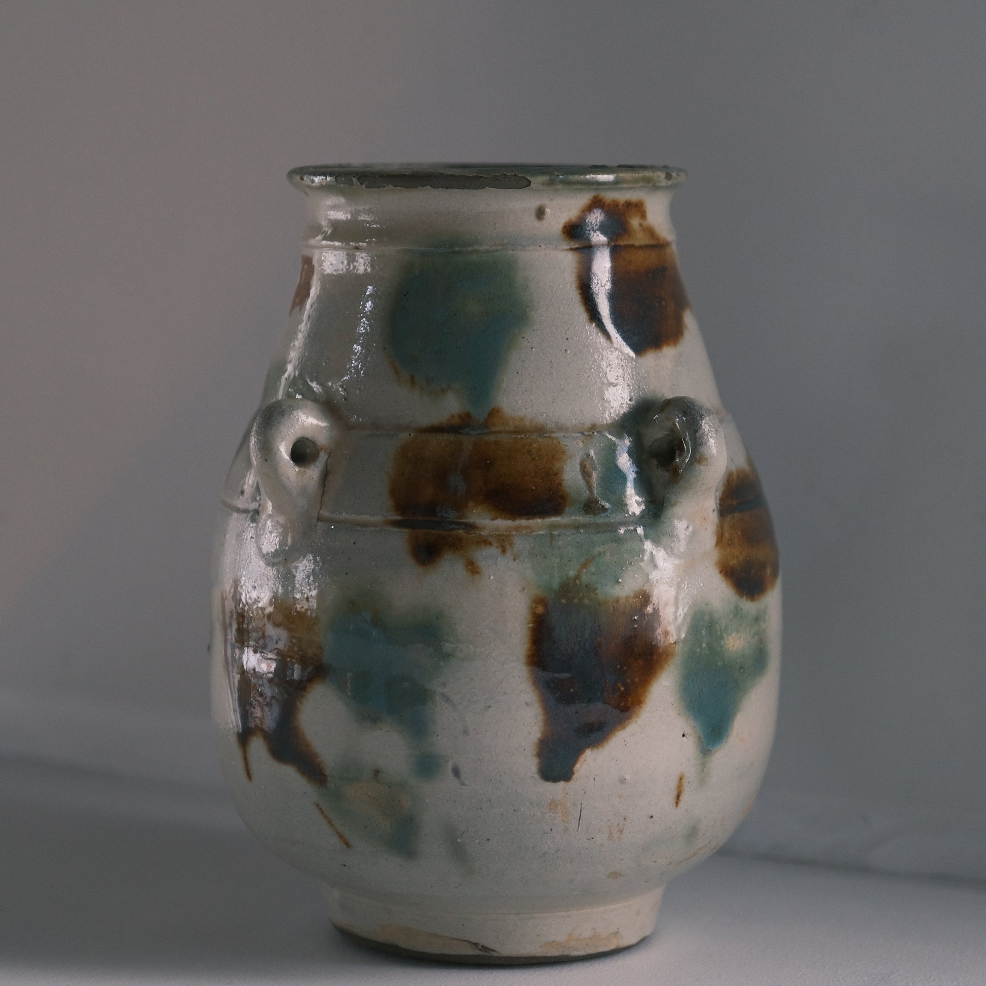 現地ではアンダガーミと呼ばれるもので主にラードなどを貯蔵し衛生面を考慮して紐を通し台所に吊るしておくものでした。かつての沖縄の暮らしには欠かせない生活道具で現代においては花瓶や調理道具入れとして活躍してくれます。大胆な点打ちによる模様や造形も含めクラシックなやちむん特有のおおらかな魅力にあふれる個体です。