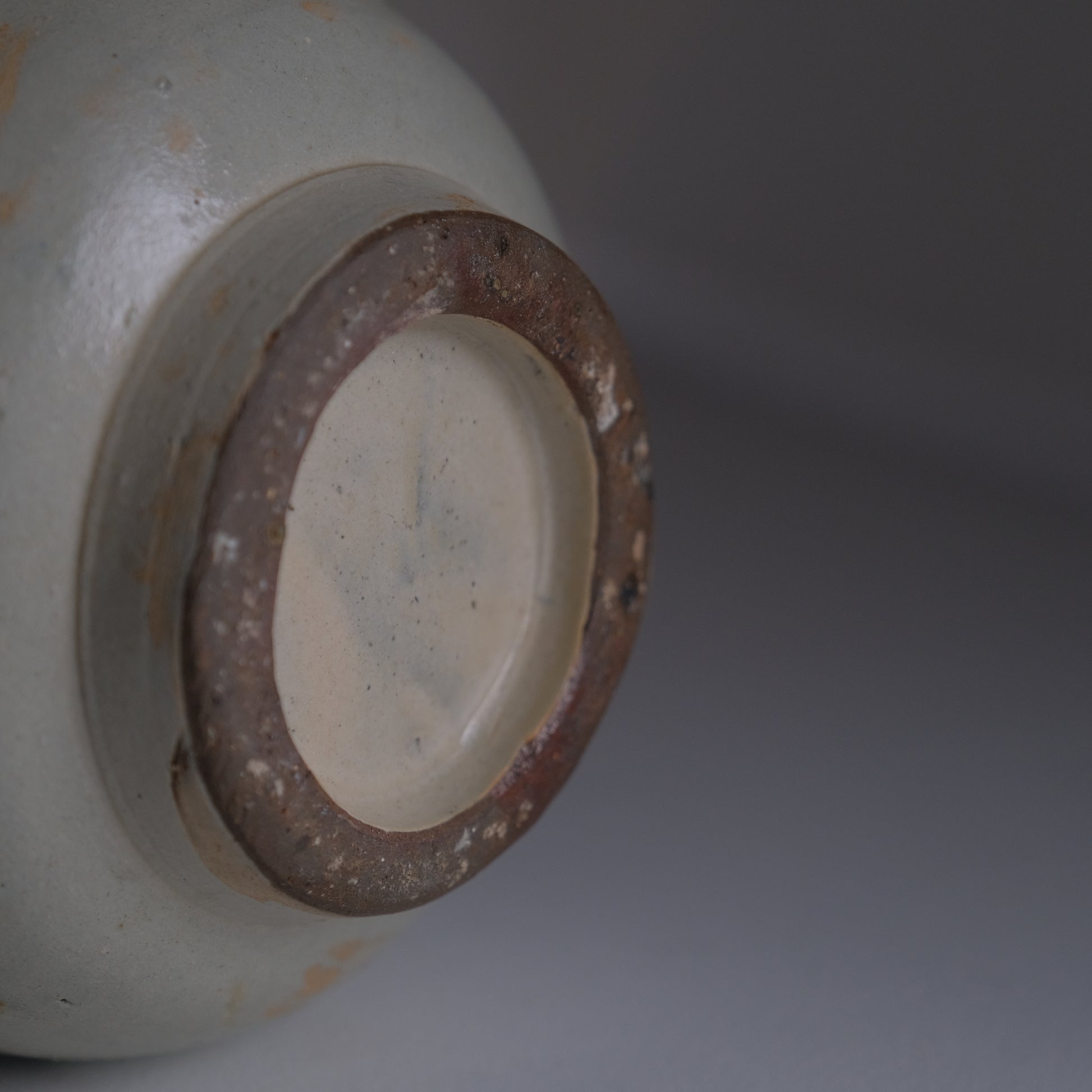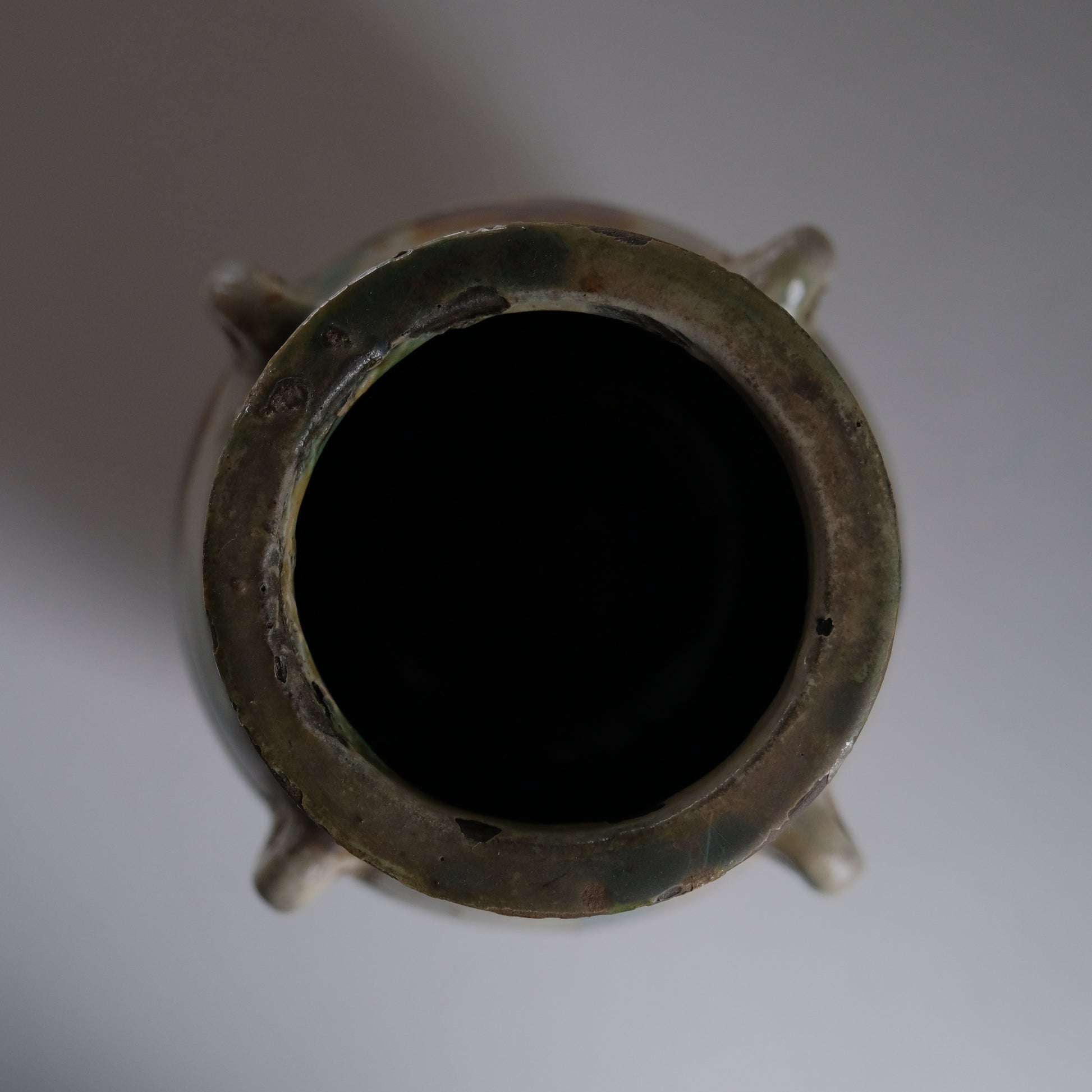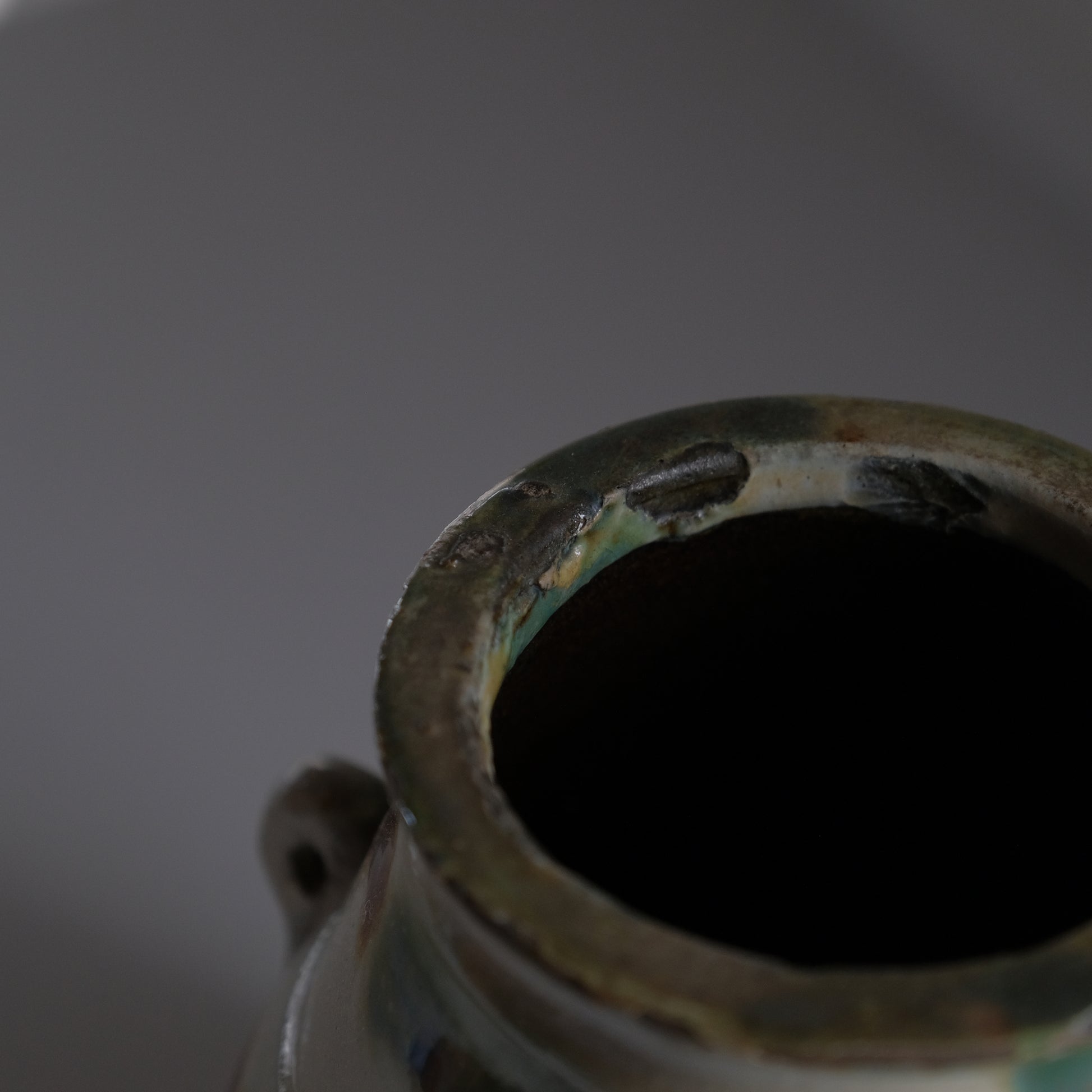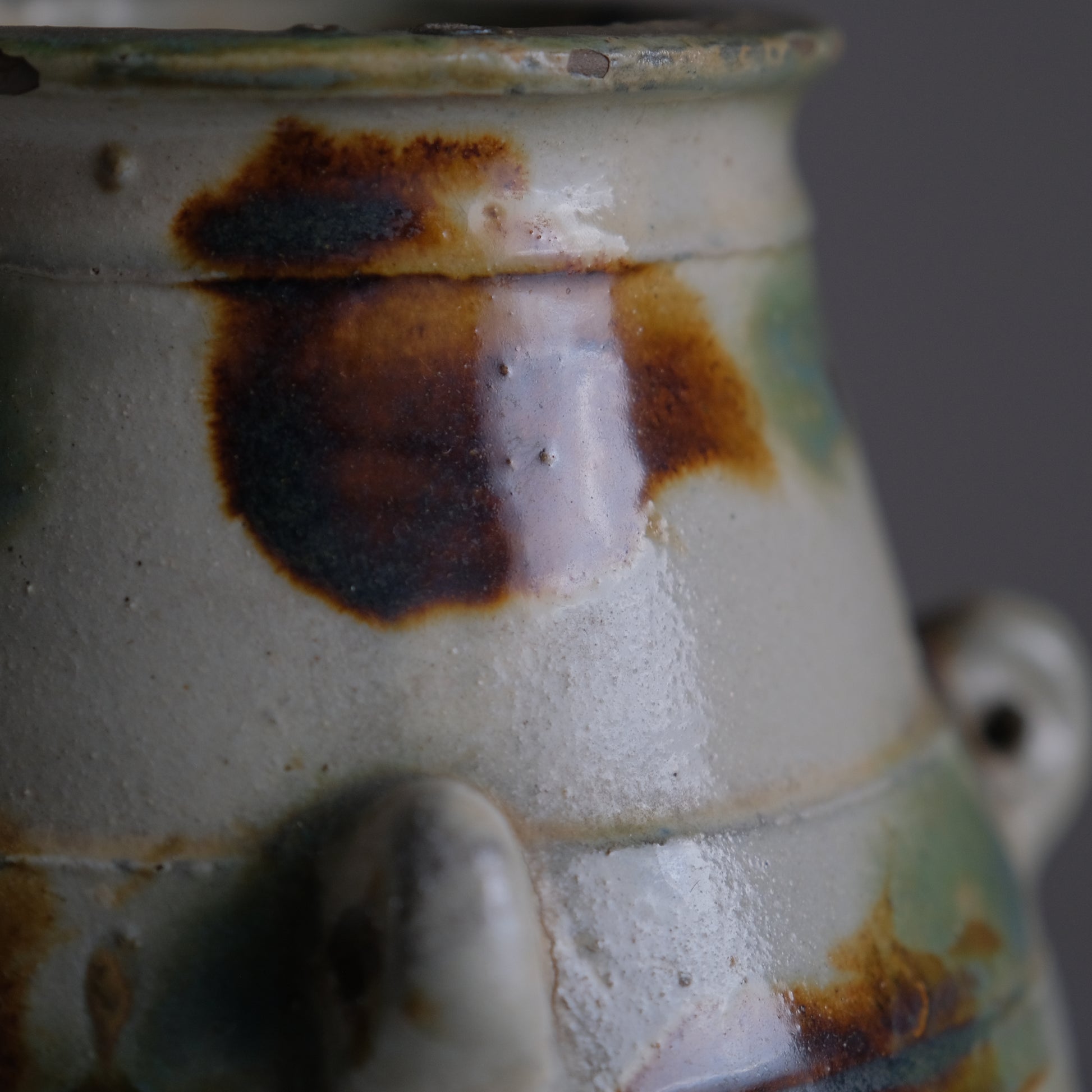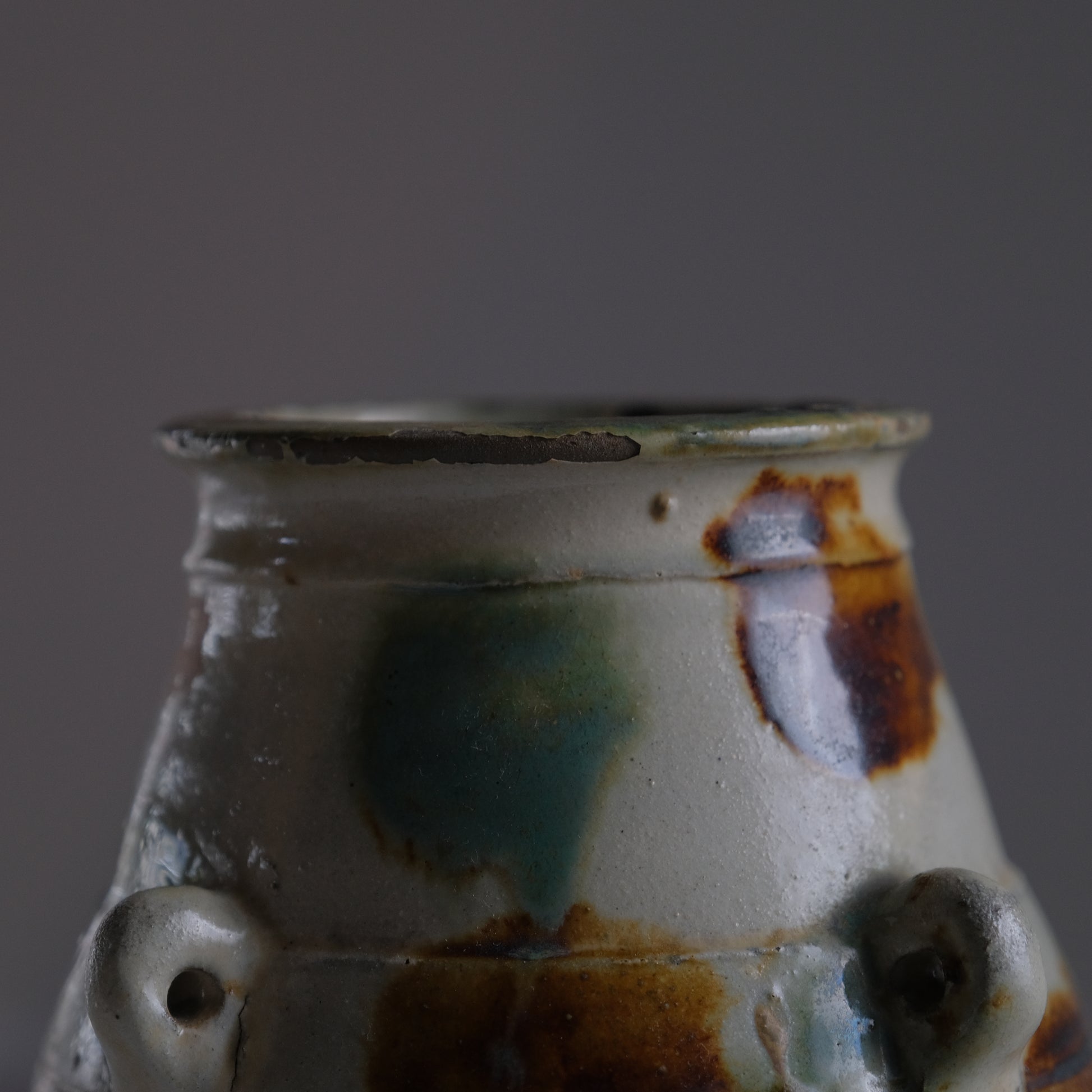 現地ではアンダガーミと呼ばれるもので主にラードなどを貯蔵し衛生面を考慮して紐を通し台所に吊るしておくものでした。かつての沖縄の暮らしには欠かせない生活道具で現代においては花瓶や調理道具入れとして活躍してくれます。大胆な点打ちによる模様や造形も含めクラシックなやちむん特有のおおらかな魅力にあふれる個体です。