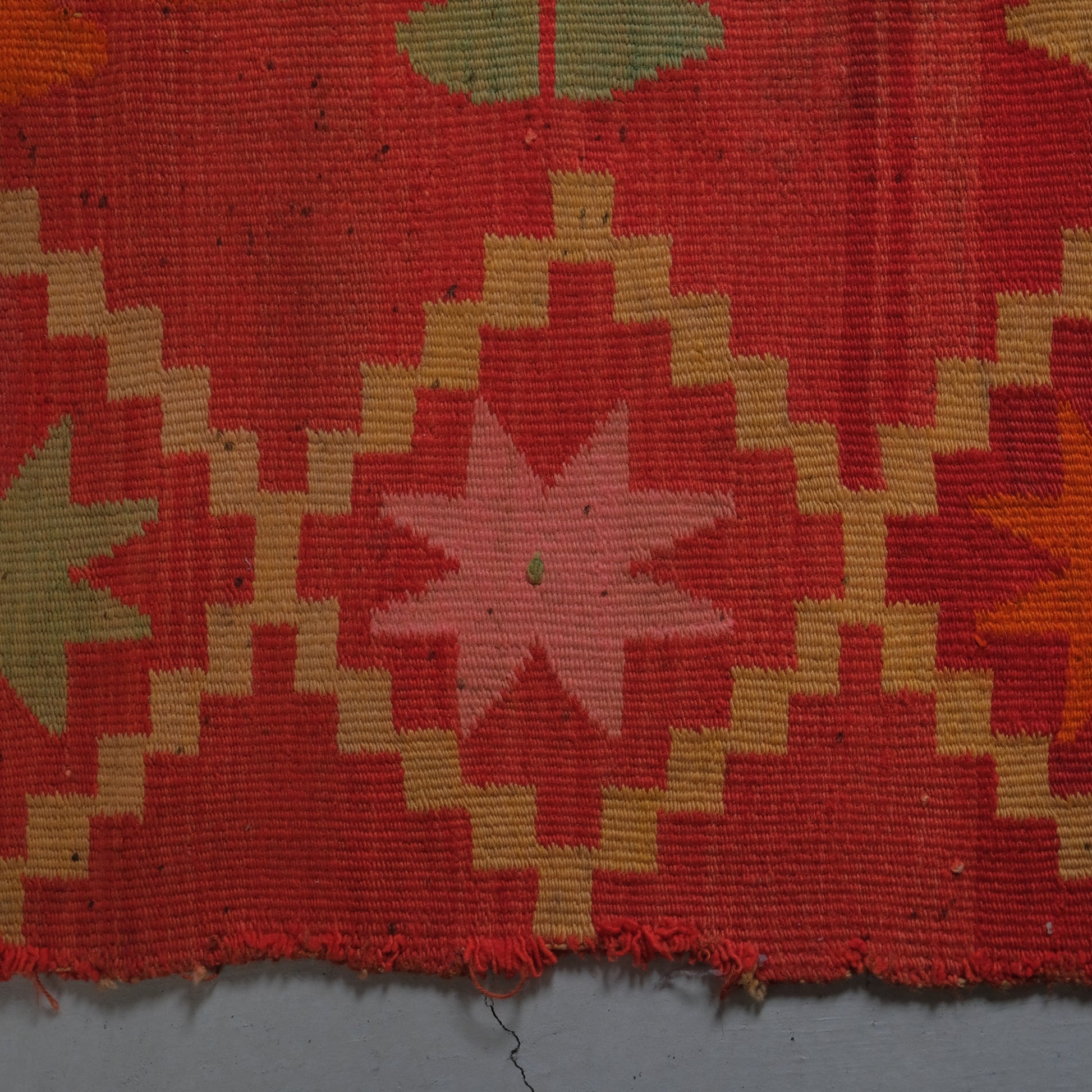 星(外側の柄)とジャガイモの花(内側の柄)がモチーフとなっており、その可愛らしい模様や鮮やかで深みのある色彩に、補修跡や褪色感など暮らしの中で生まれた経年の魅力が加わり、どこか親しみのある温かい表情がたまりません。