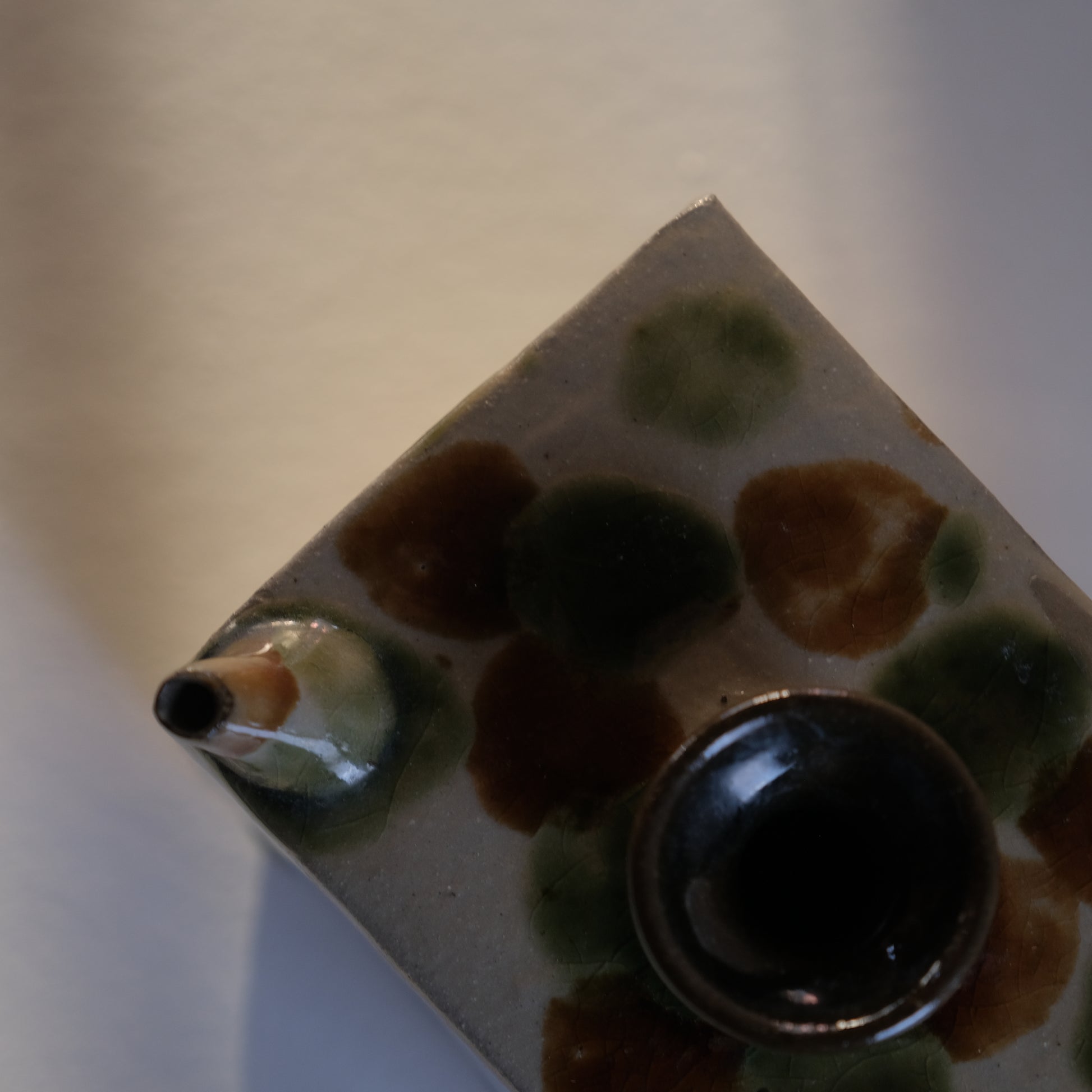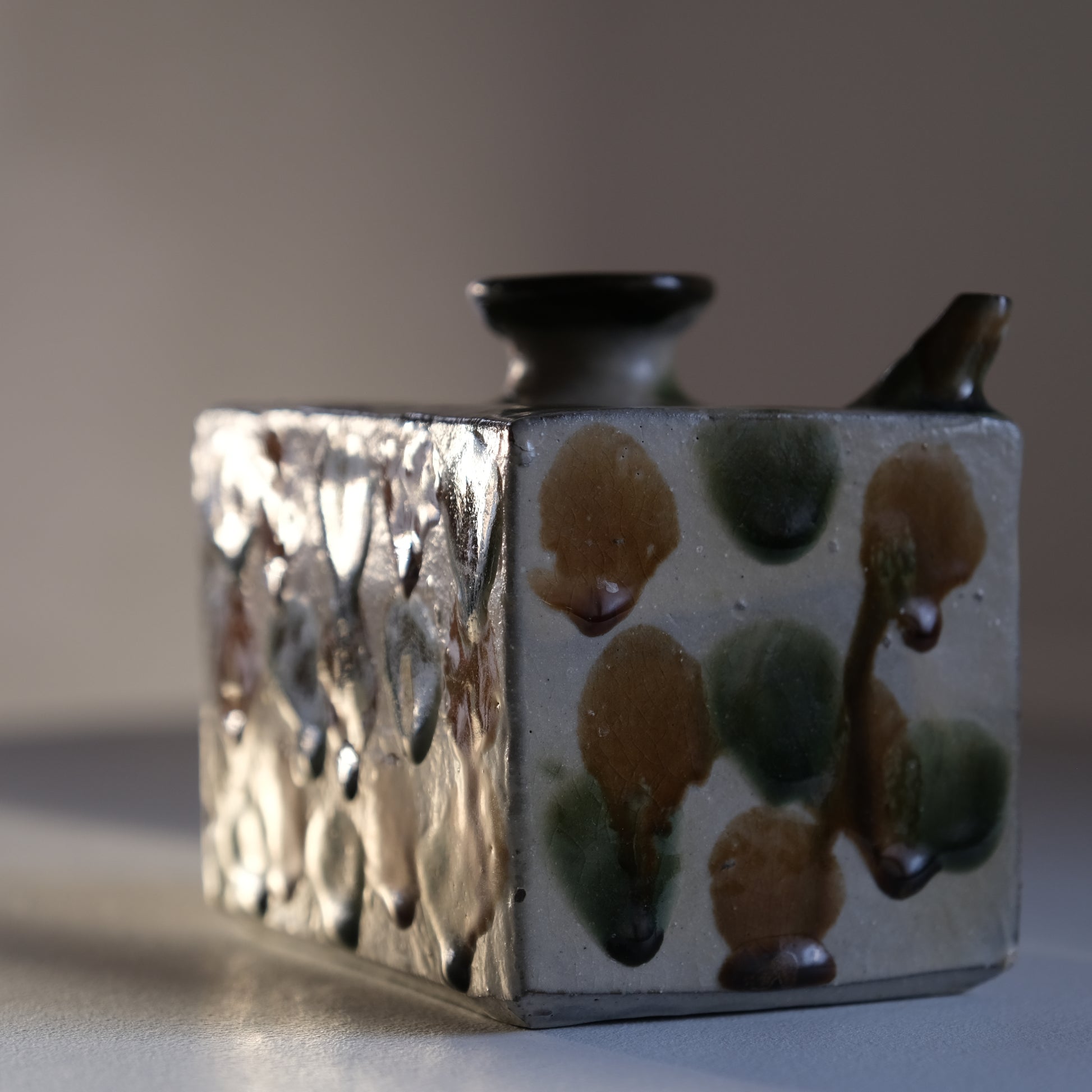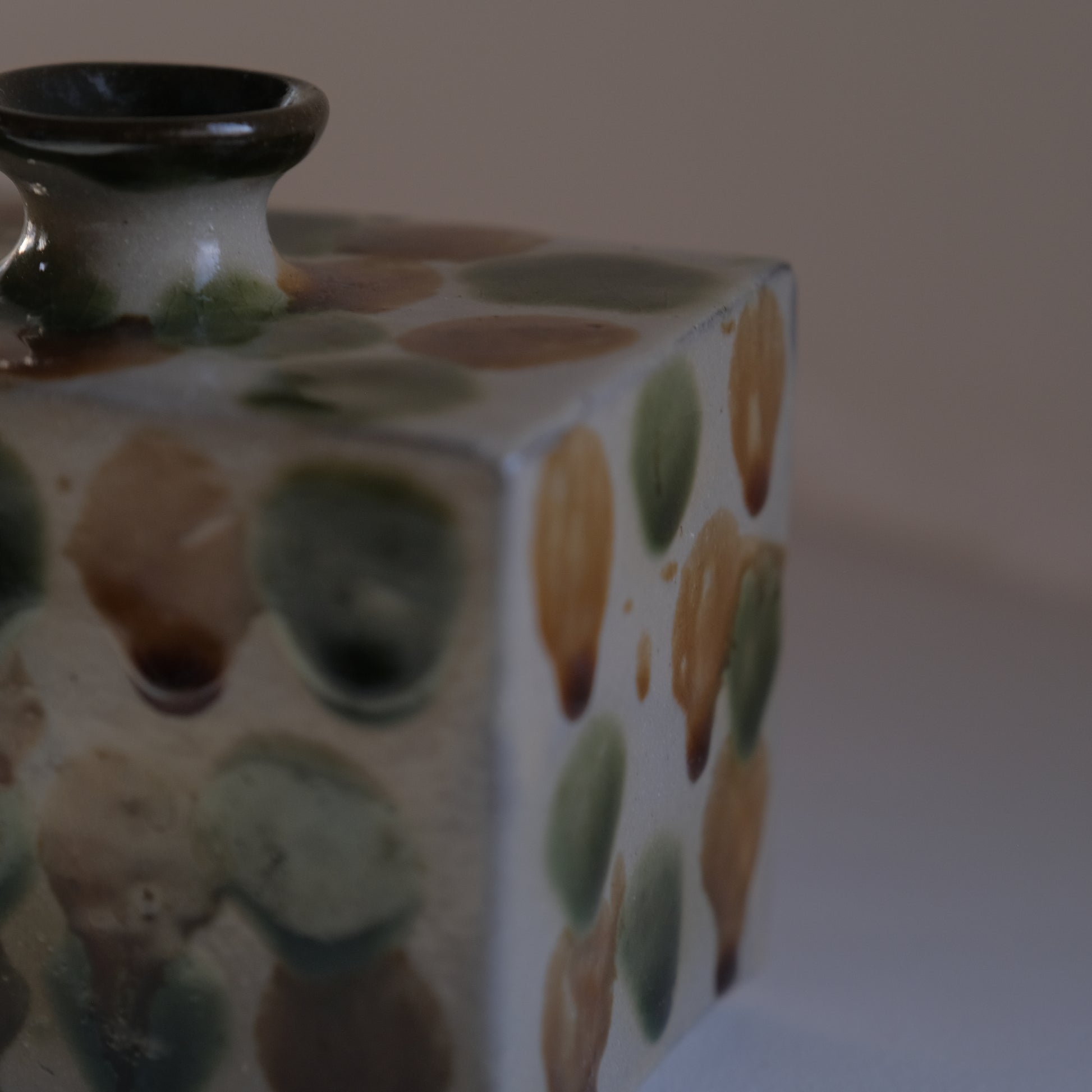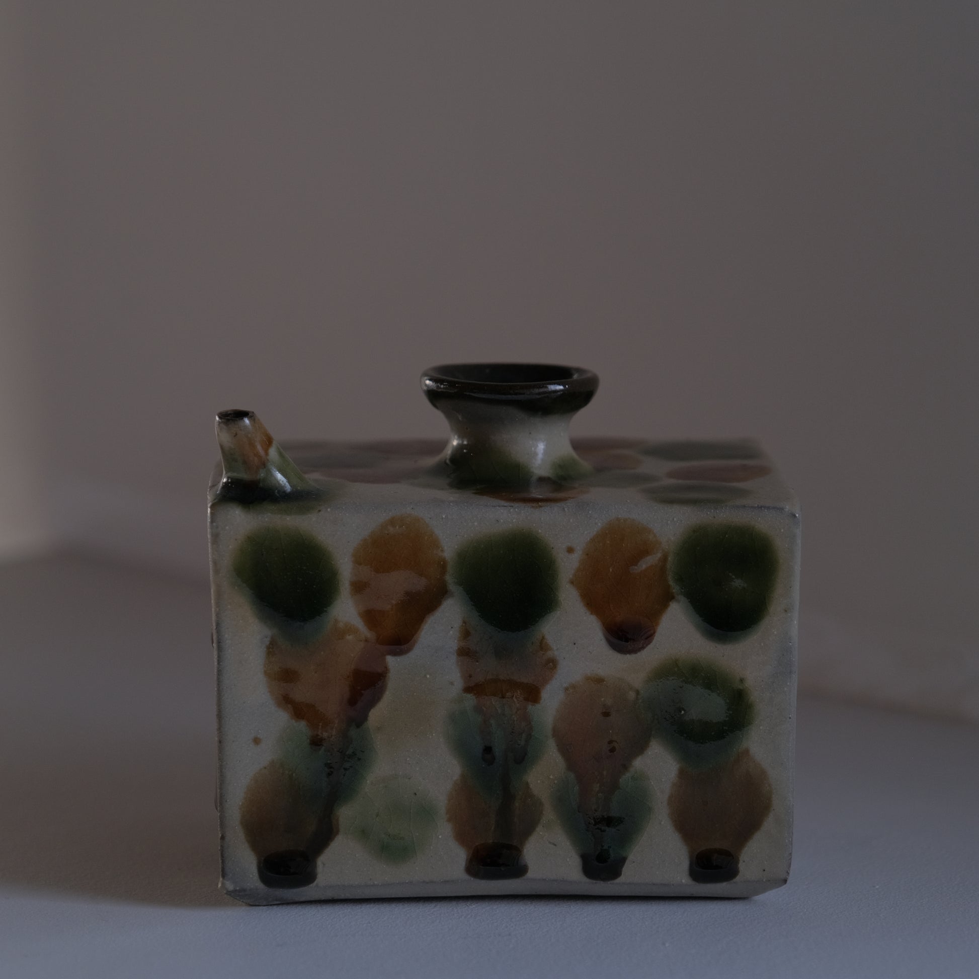 沖縄の古手の三彩紋酒器。おおらかな絵付けとその佇まいは温かく、花器としてインテリア小物としても活躍してくれそうです。沖縄の焼き物は元々現在の那覇市壺屋地区にて盛んに作られていました。大正から昭和にかけ民藝運動により本土でも広く認知され、金城次郎をはじめ数々の名工達も生まれていきますが、1970年以降市街地であった壺屋地区で薪窯による焼き物づくりが規制され現在に続く読谷村で焼き物がつくられるようになっていきます。