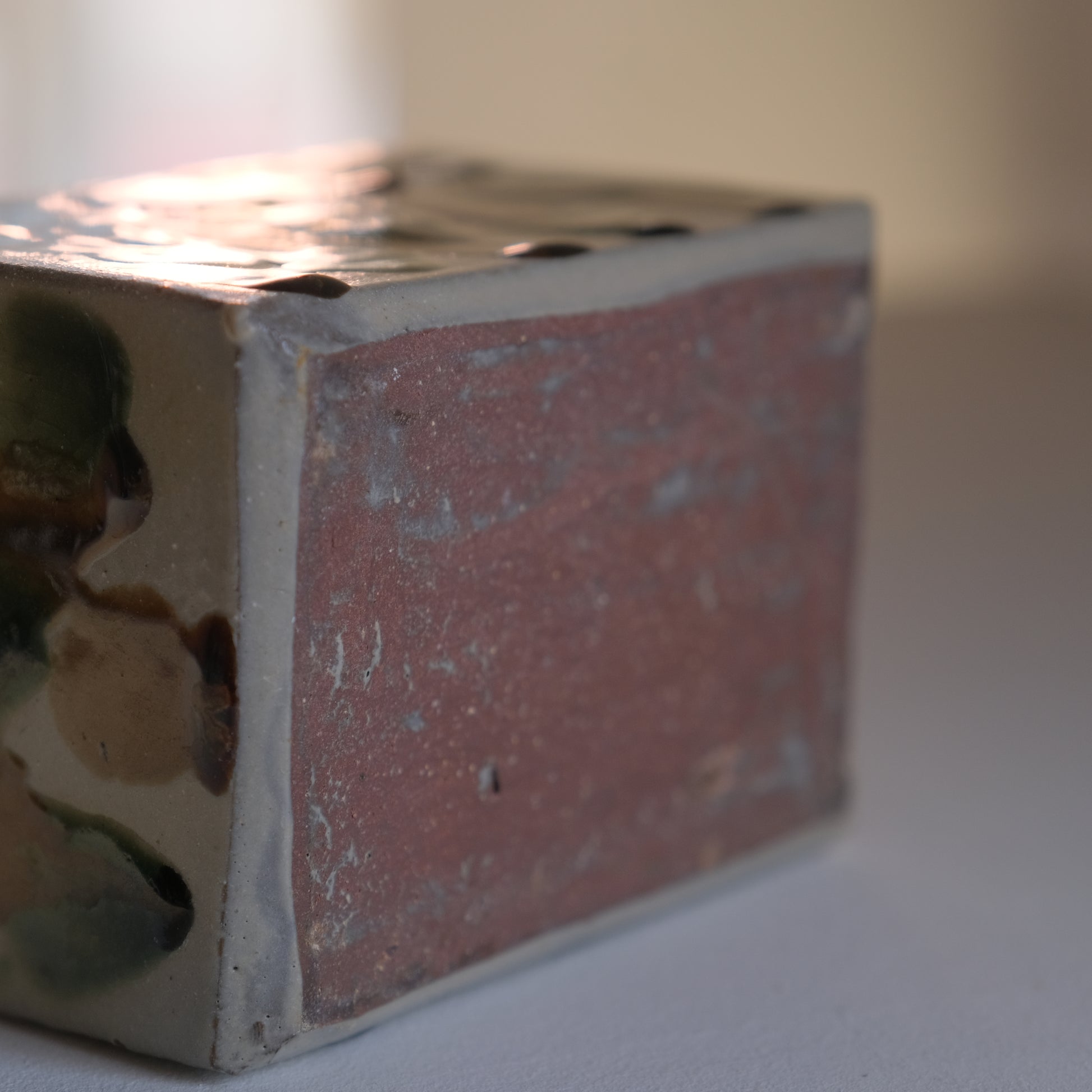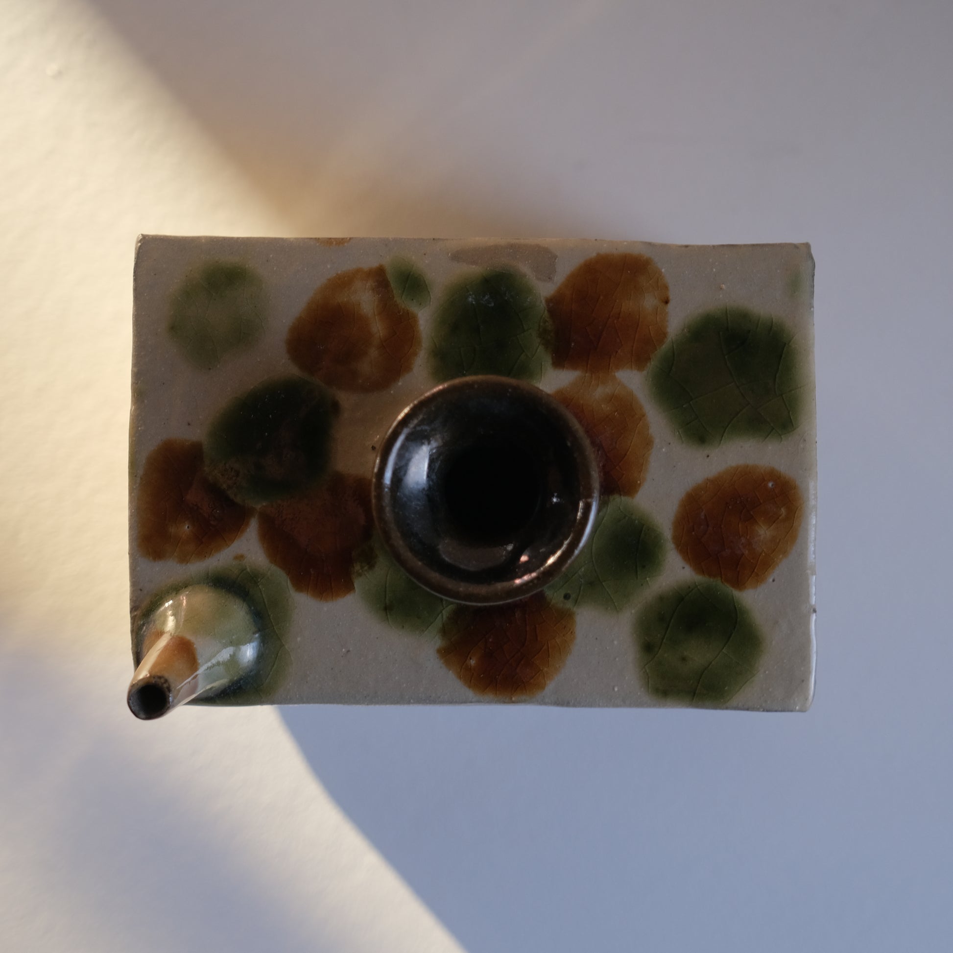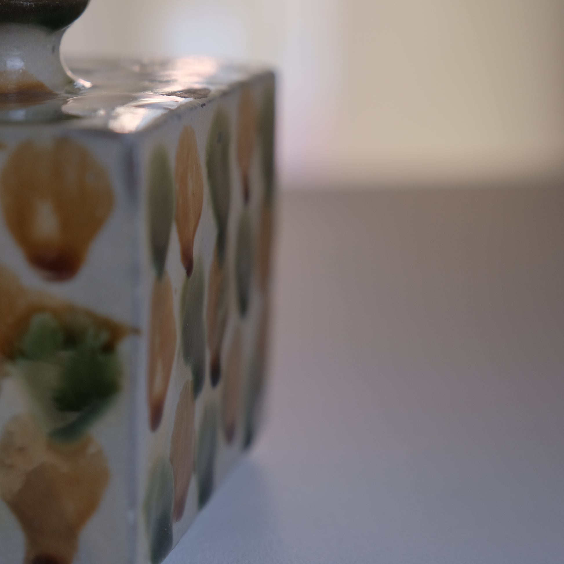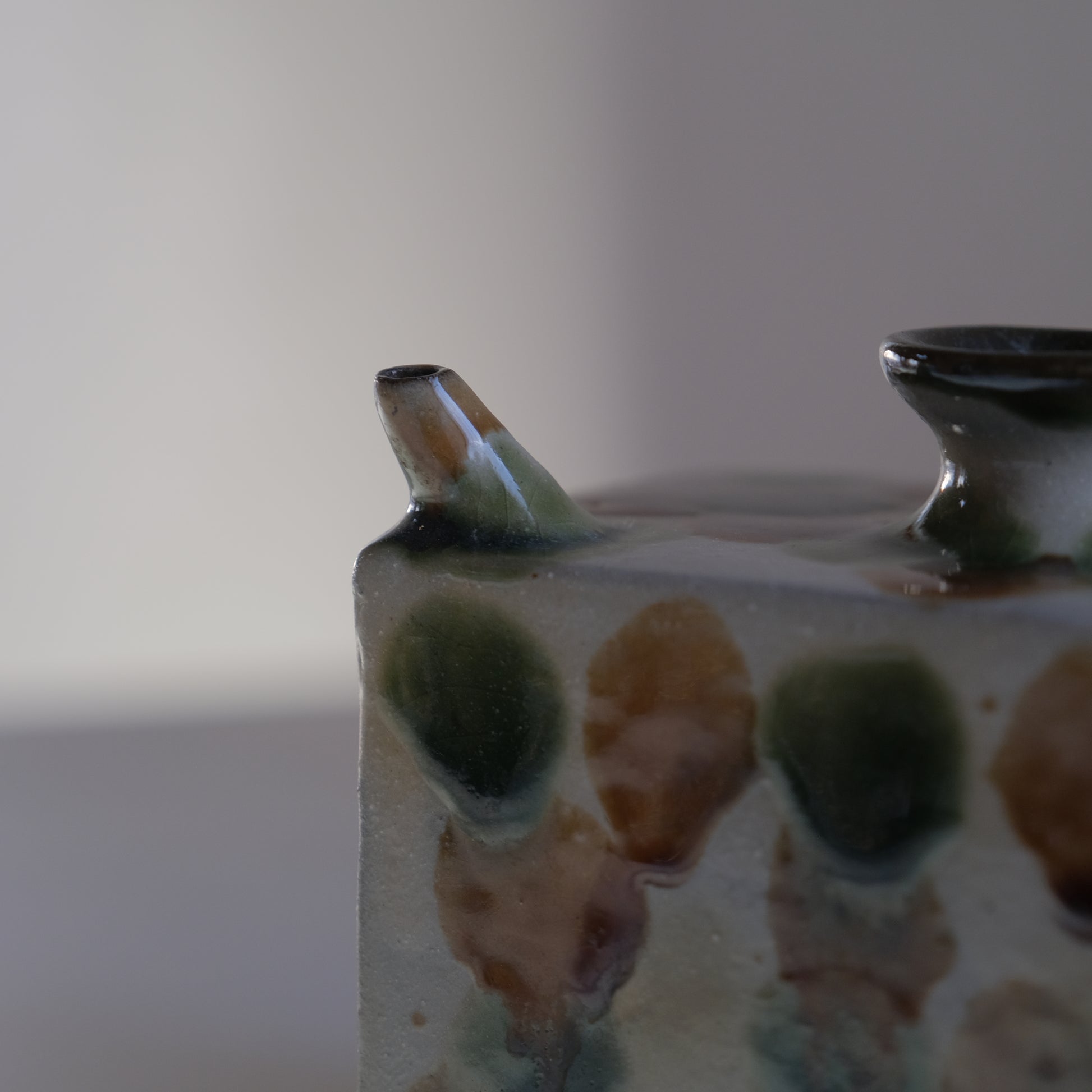 沖縄の古手の三彩紋酒器。おおらかな絵付けとその佇まいは温かく、花器としてインテリア小物としても活躍してくれそうです。沖縄の焼き物は元々現在の那覇市壺屋地区にて盛んに作られていました。大正から昭和にかけ民藝運動により本土でも広く認知され、金城次郎をはじめ数々の名工達も生まれていきますが、1970年以降市街地であった壺屋地区で薪窯による焼き物づくりが規制され現在に続く読谷村で焼き物がつくられるようになっていきます。