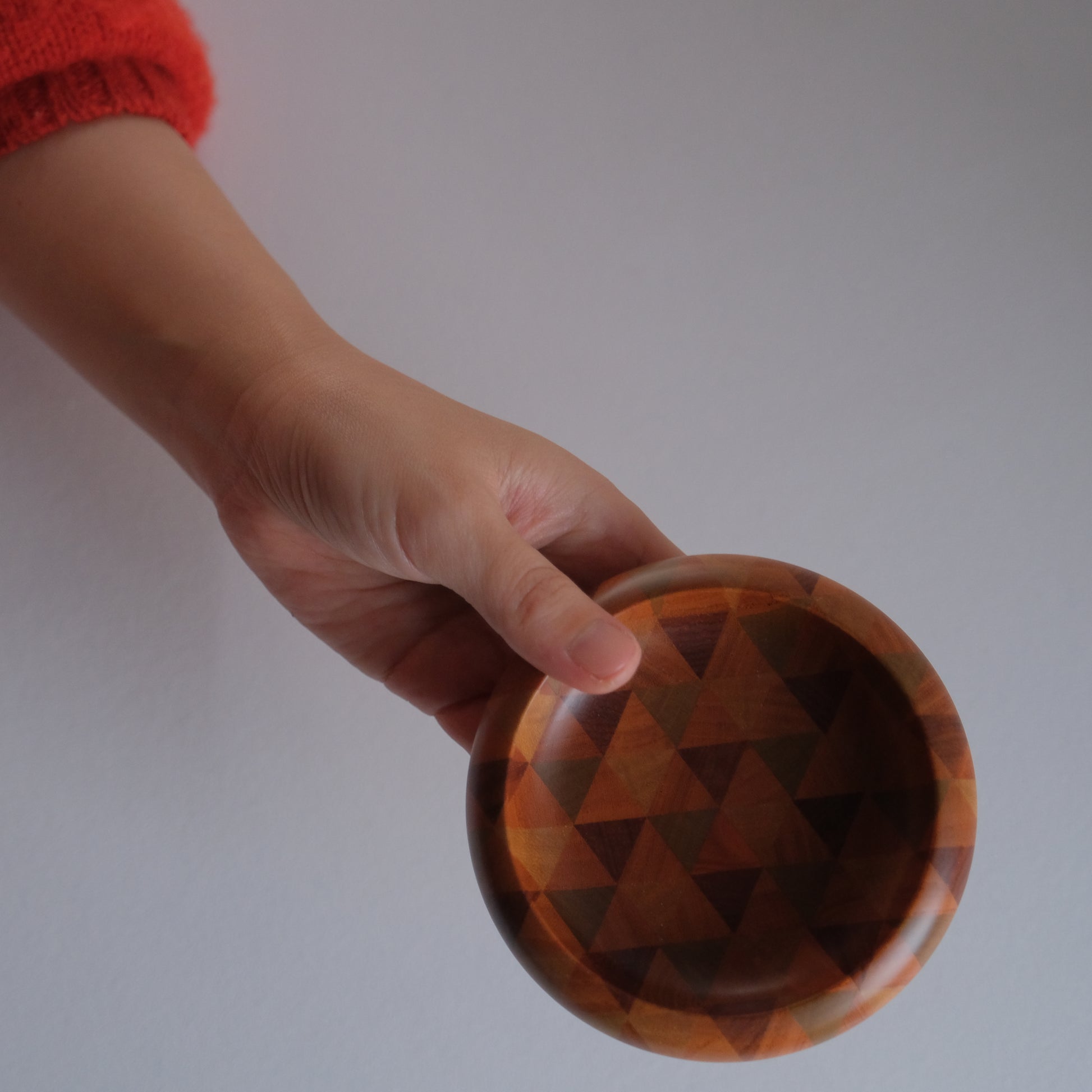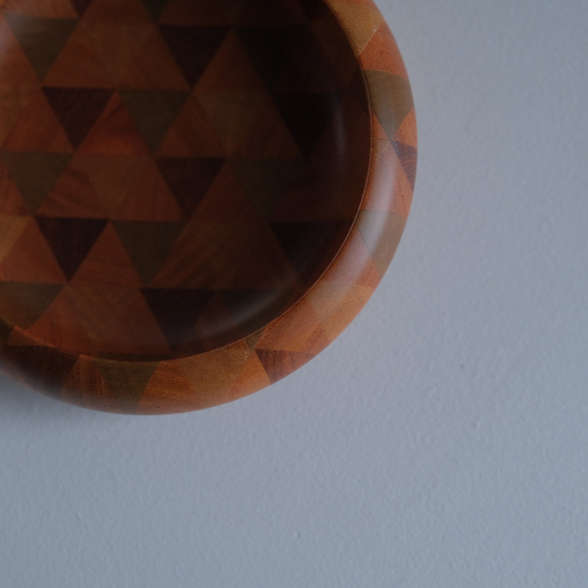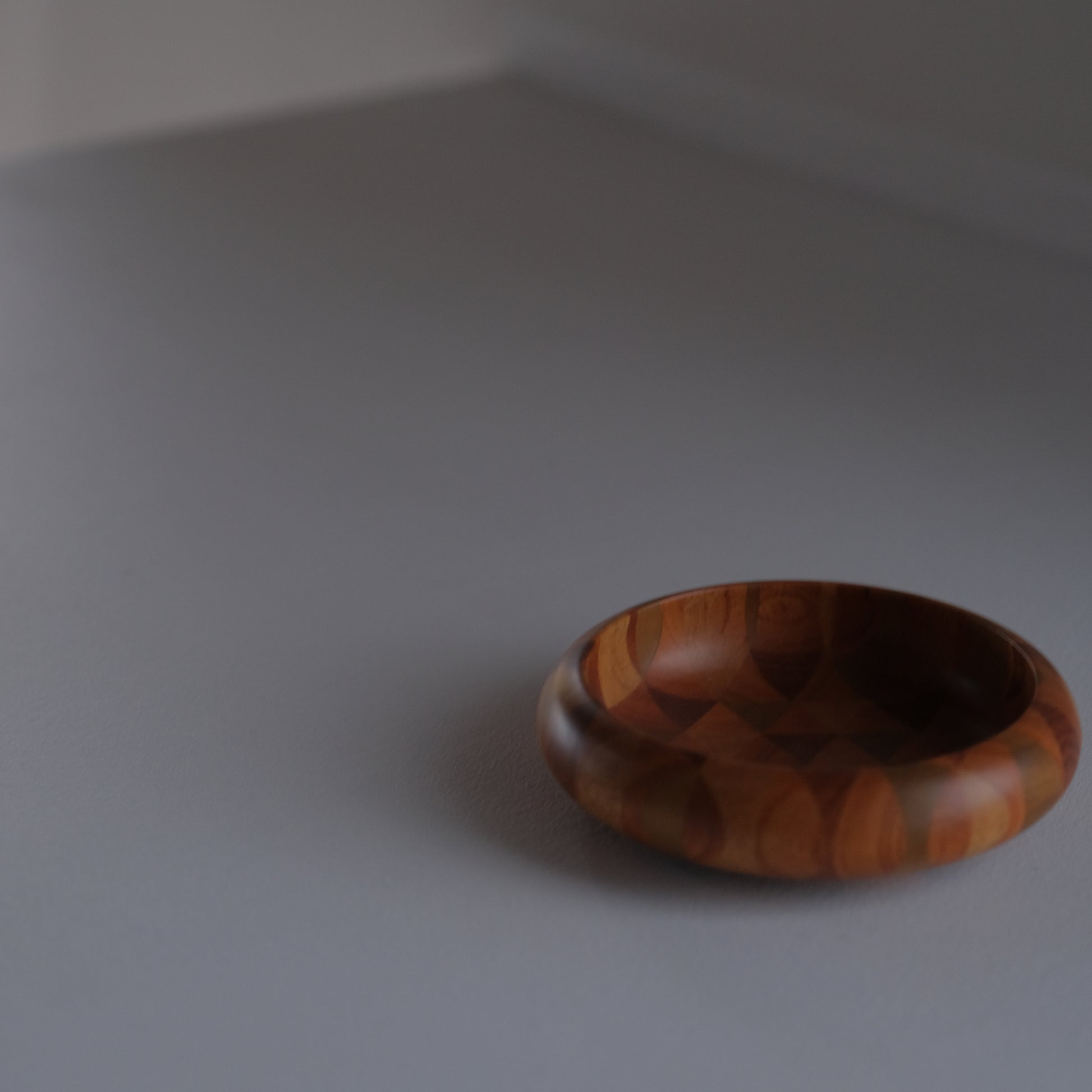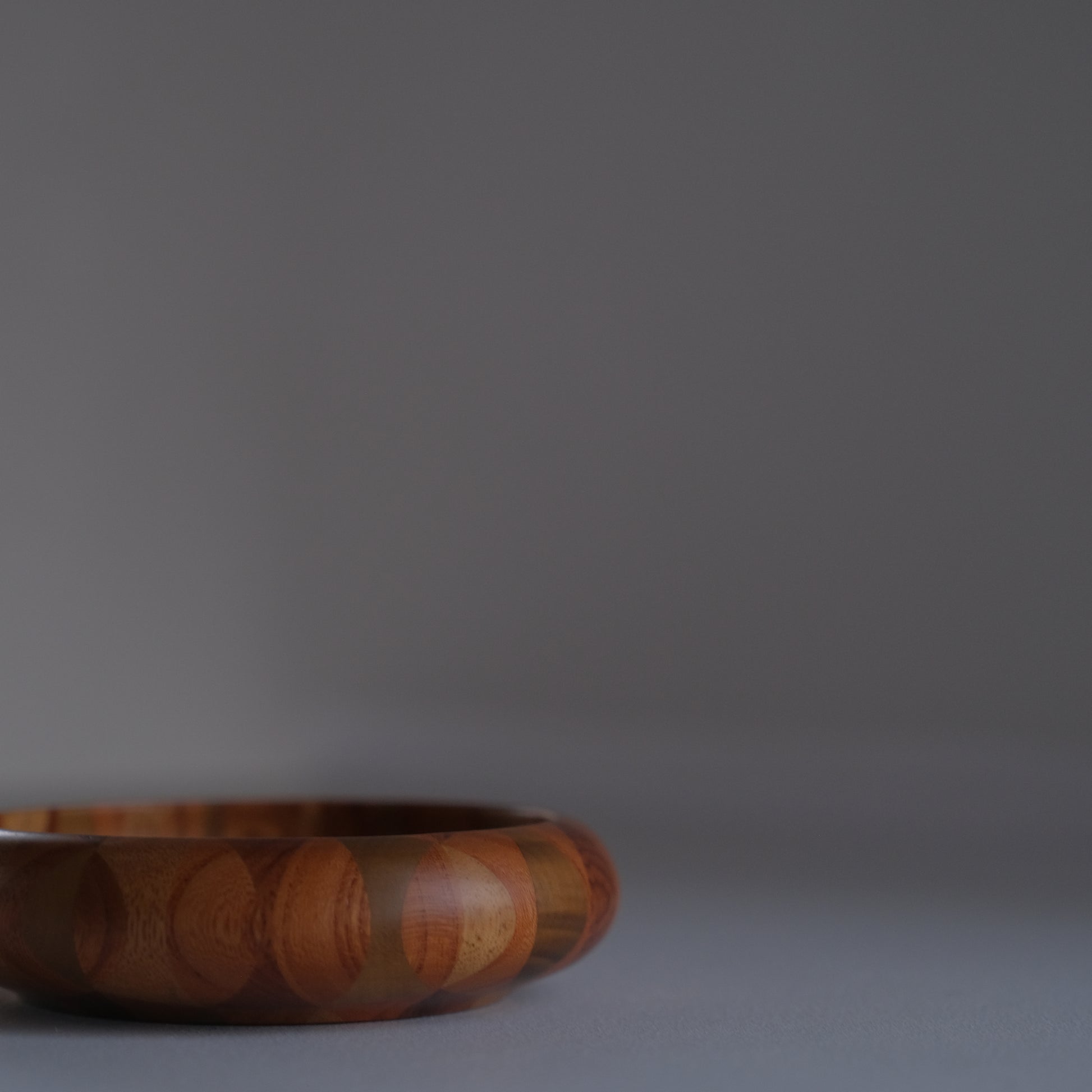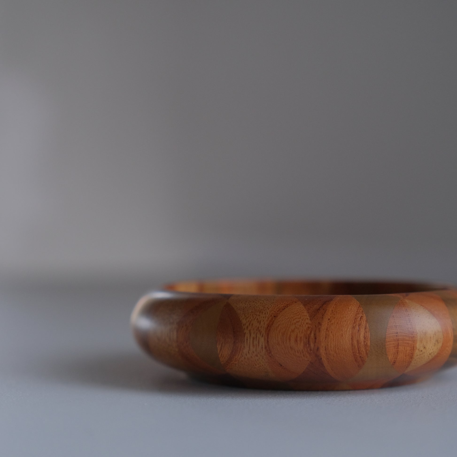 通常の寄せ木を薄く削り貼り付ける『ズク貼り』とは異なり寄せ合った木そのものを轆轤で成形していく贅沢な技法で、内と外両面にひと続きのモダンな模様が現れます。模様の出方を計算しながら寄せた木を精密に削りだす熟練の技。それは時代と共に需要が薄れ継承者が少なくなっていた寄木細工の復興を心に、苦労の末に金指勝悦さんによって生み出されたものです。現在では箱根駅伝の優勝トロフィーなども無垢作りで作られた寄木細工が採用されています。