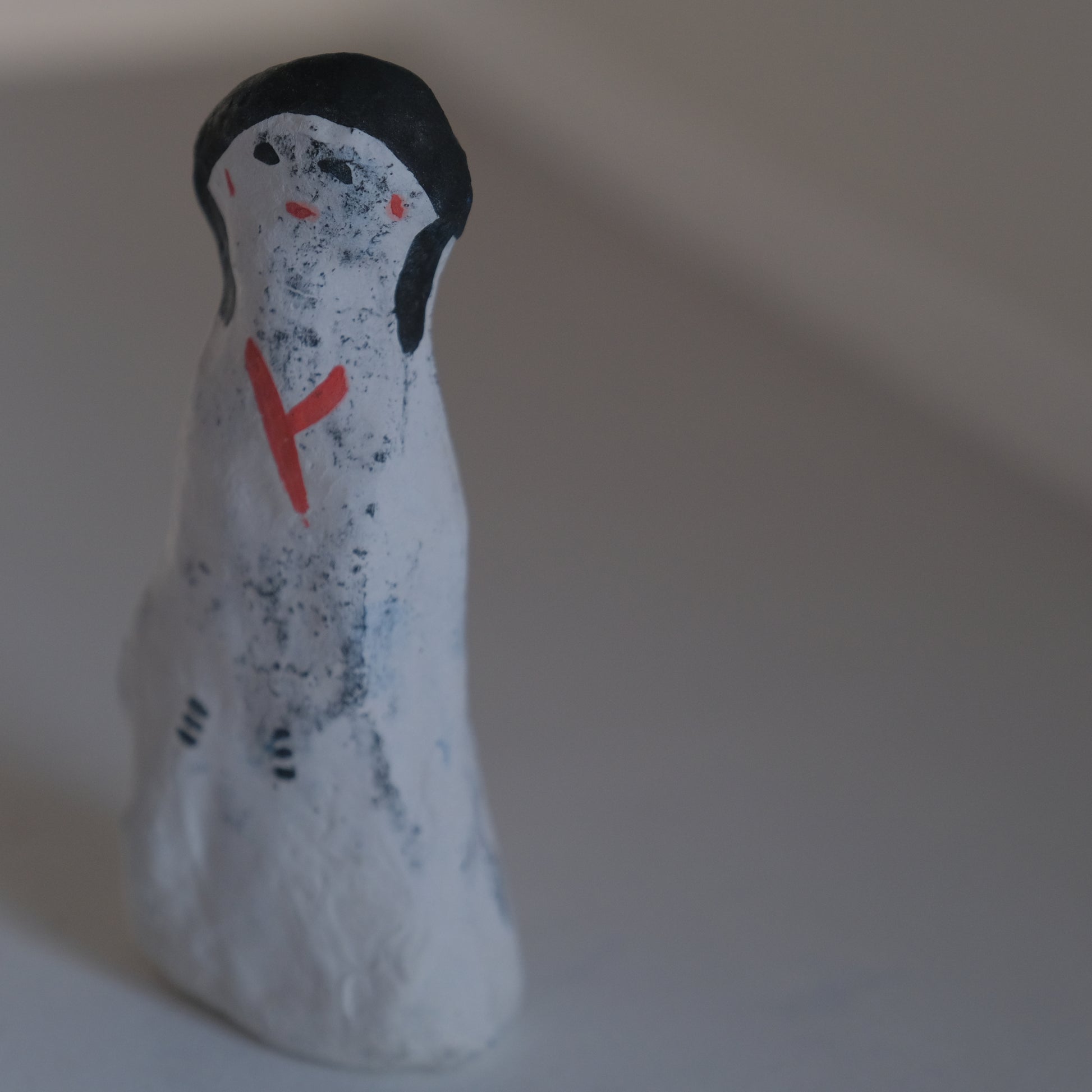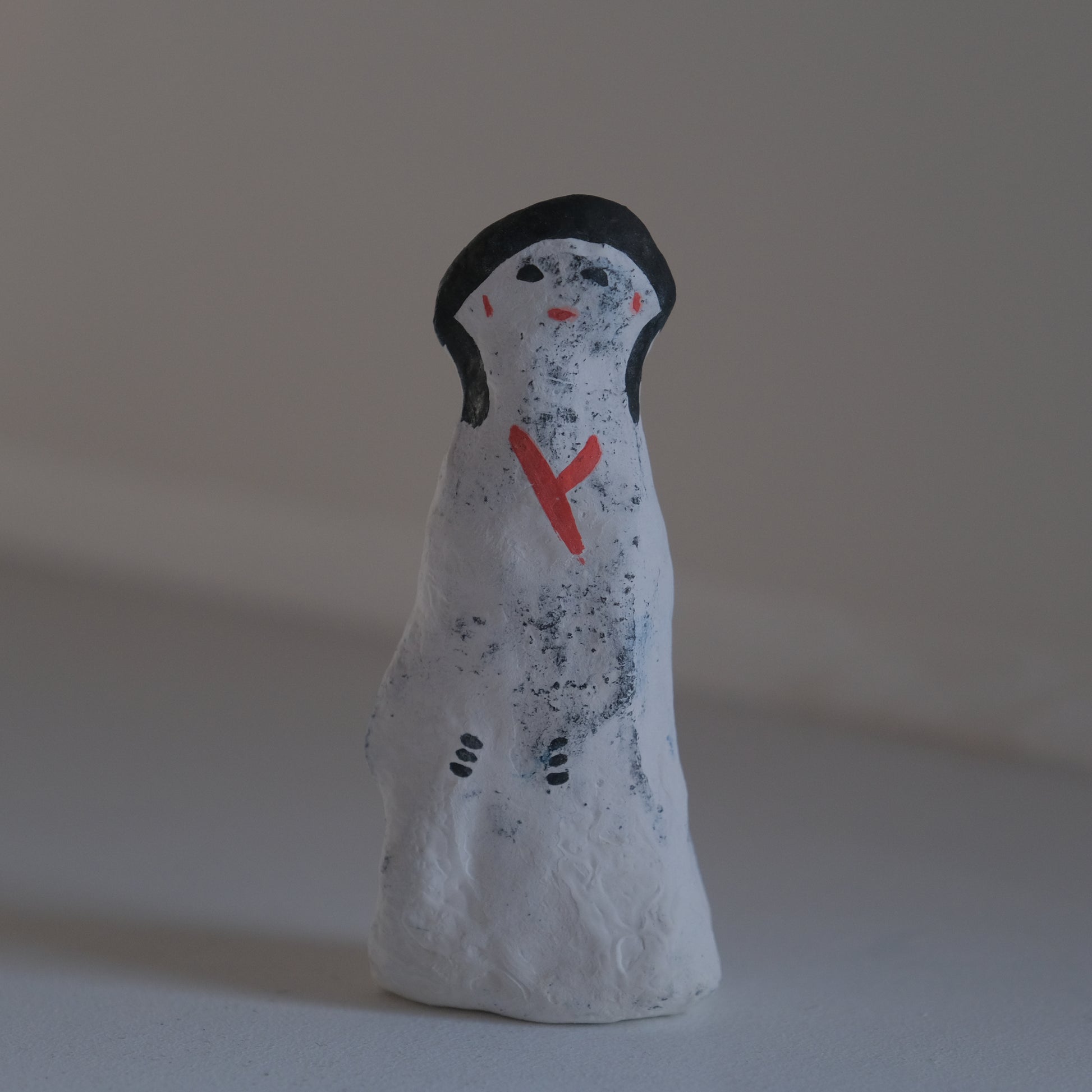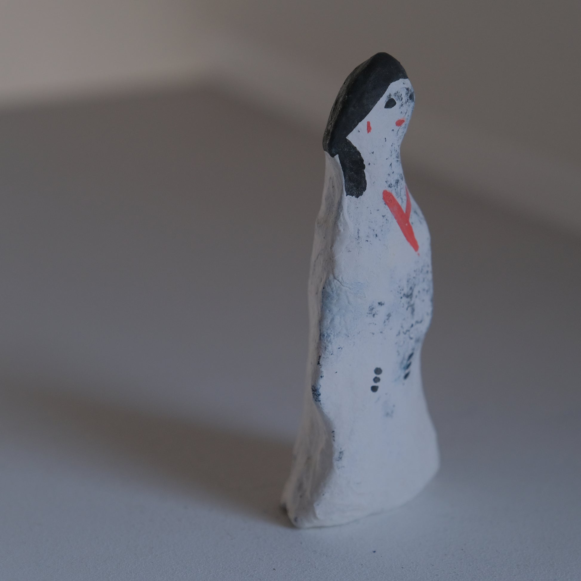 古い個体ならではの味わいある土の風合いが感じられる「左前人形」。
