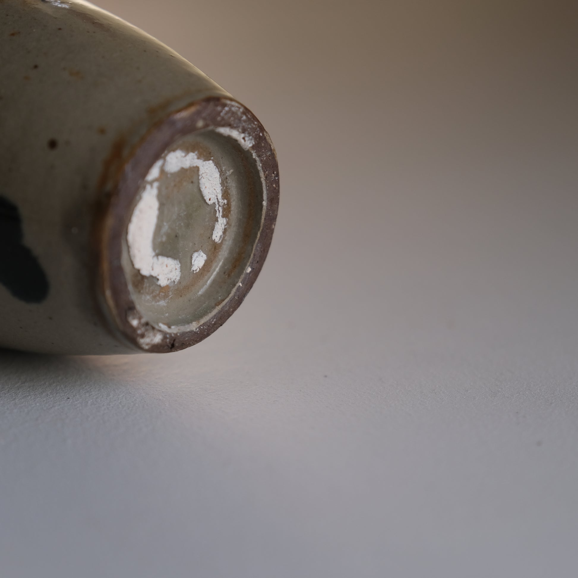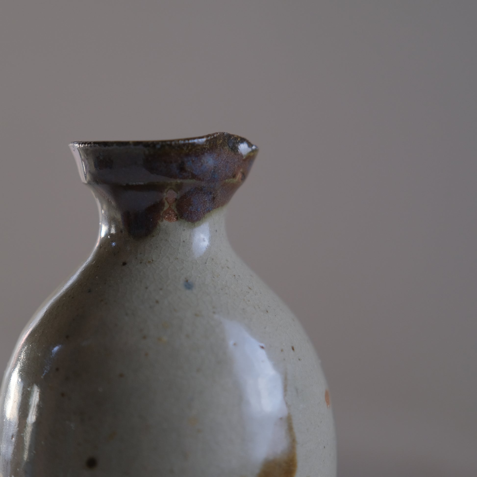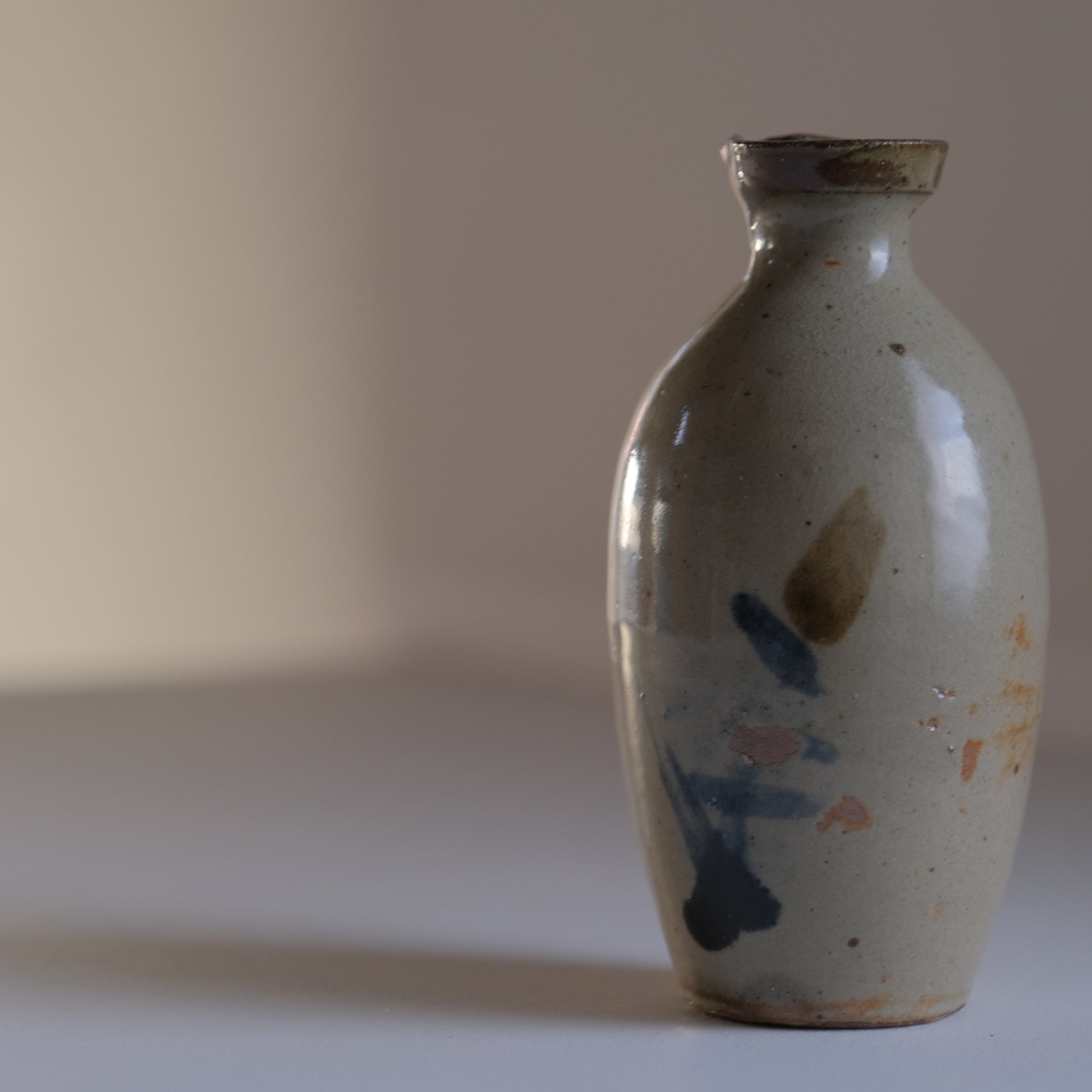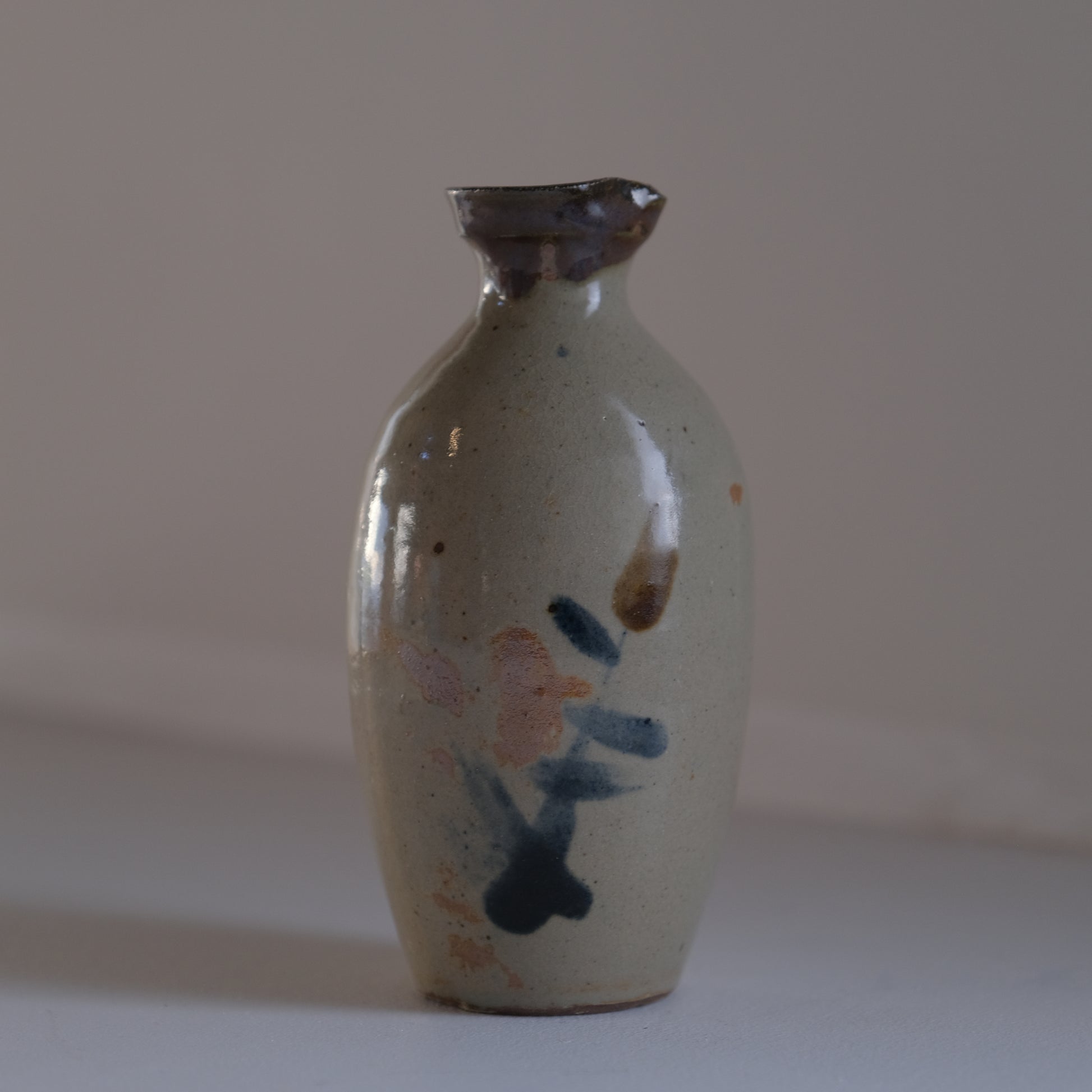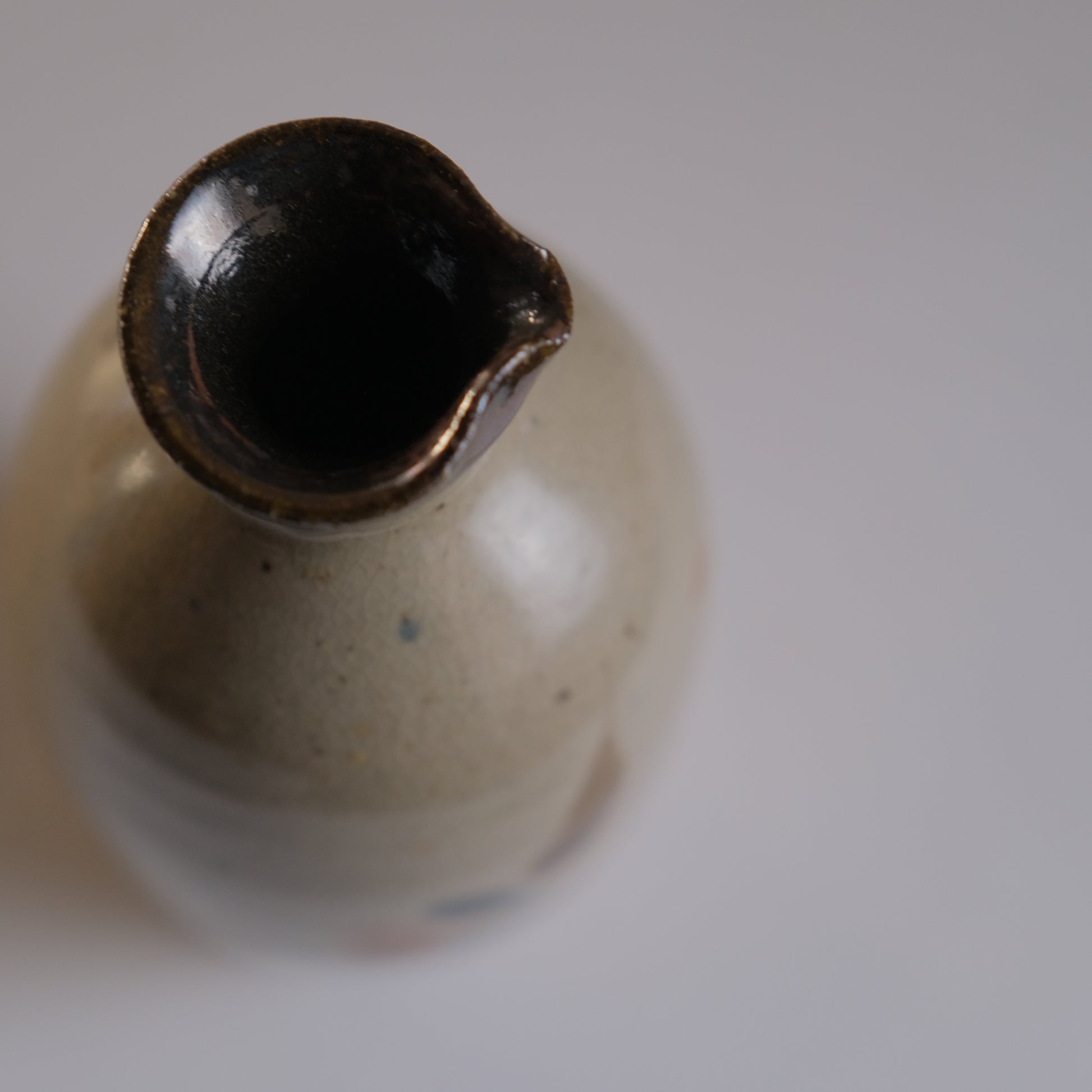 壺屋焼の古作の徳利です。1人用の1合徳利(180ml)より少し大きい200mlの容量があり、使い勝手のいい酒器です。沖縄の焼き物は元々現在の那覇市壺屋地区にて盛んに作られていました。大正から昭和にかけ民藝運動により本土でも広く認知され、金城次郎をはじめ数々の名工達も生まれていきますが、1970年以降市街地であった壺屋地区で薪窯による焼き物づくりが規制され現在に続く読谷村で焼き物がつくられるようになっていきます。