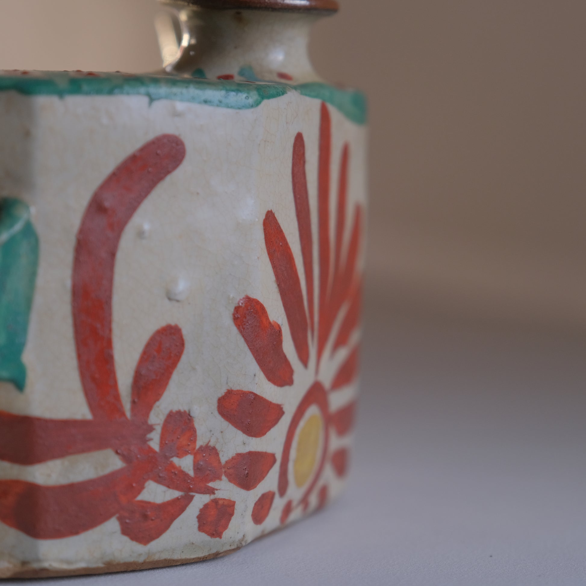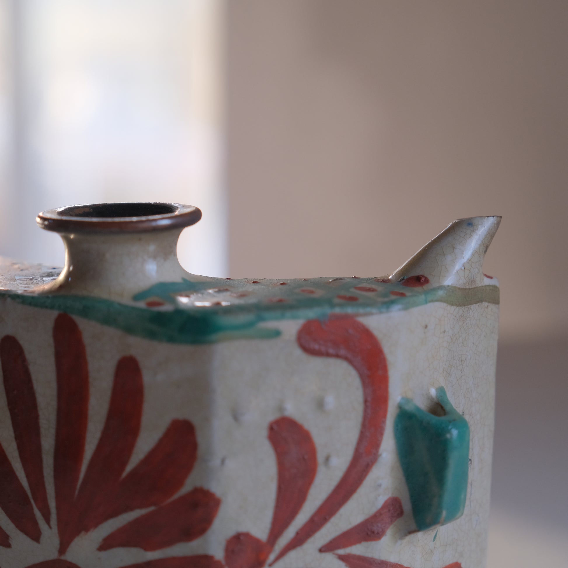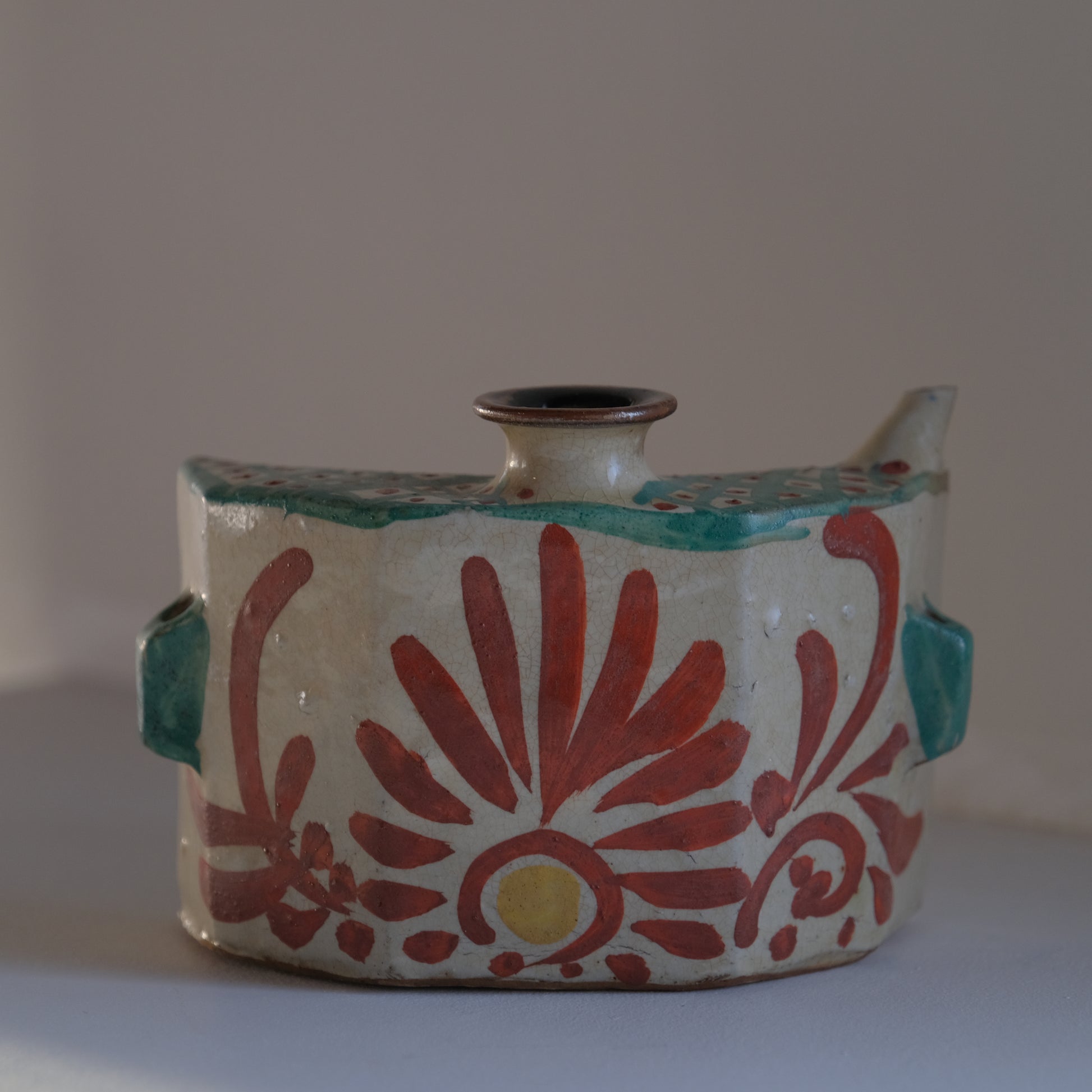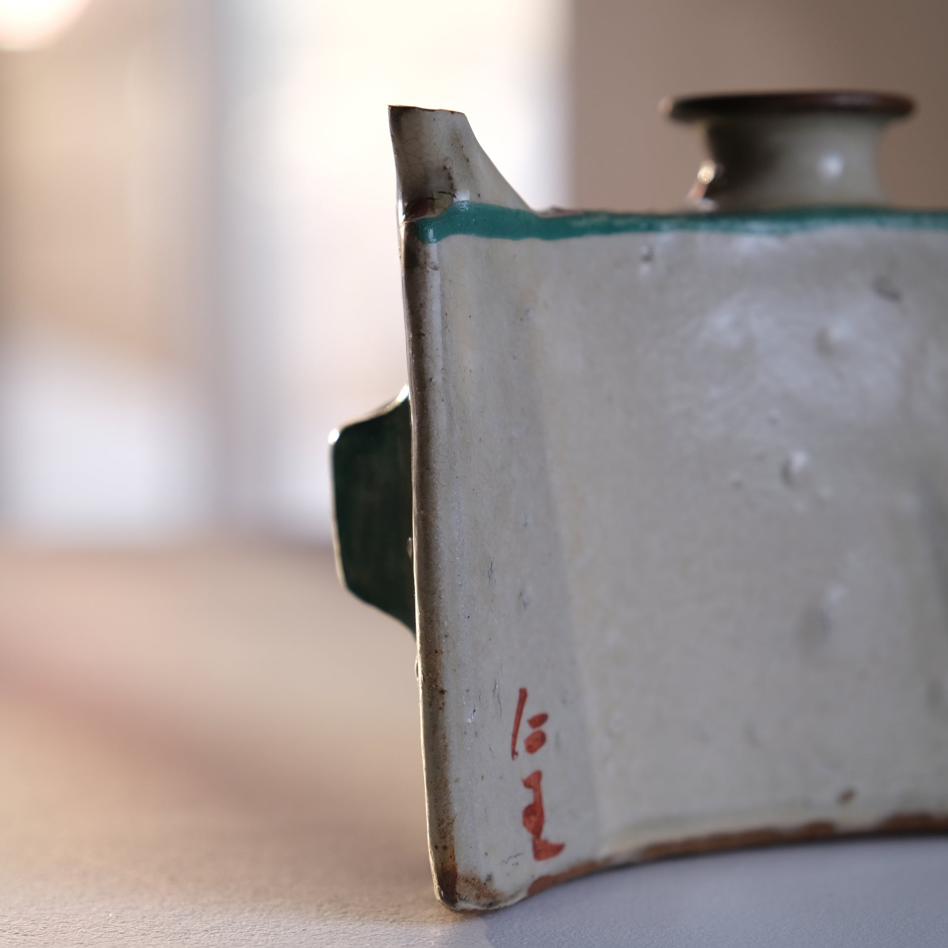 壺屋焼仁王窯の古い抱瓶。紐を通し腰に掛けて持ち運ぶ水筒のような道具として使われていた抱瓶ですが、鑑賞用やインテリアに取り入れて花器としても存在感を放ってくれそうです。沖縄の焼き物は元々現在の那覇市壺屋地区にて盛んに作られていました。大正から昭和にかけ民藝運動により本土でも広く認知され、金城次郎をはじめ数々の名工達も生まれていきますが、1970年以降市街地であった壺屋地区で薪窯による焼き物づくりが規制され現在に続く読谷村で焼き物がつくられるようになっていきます。