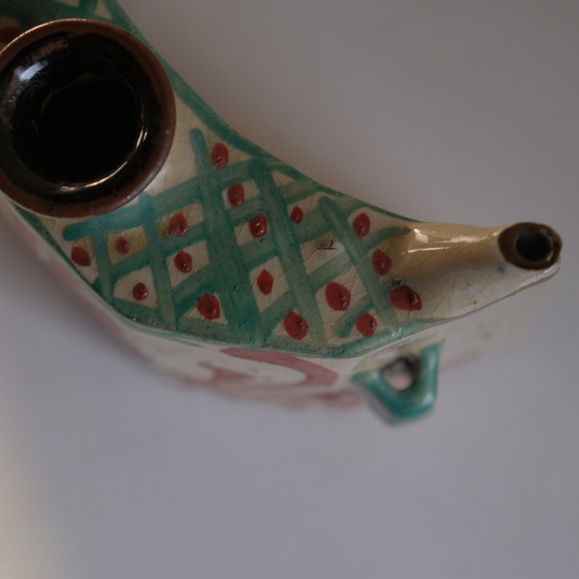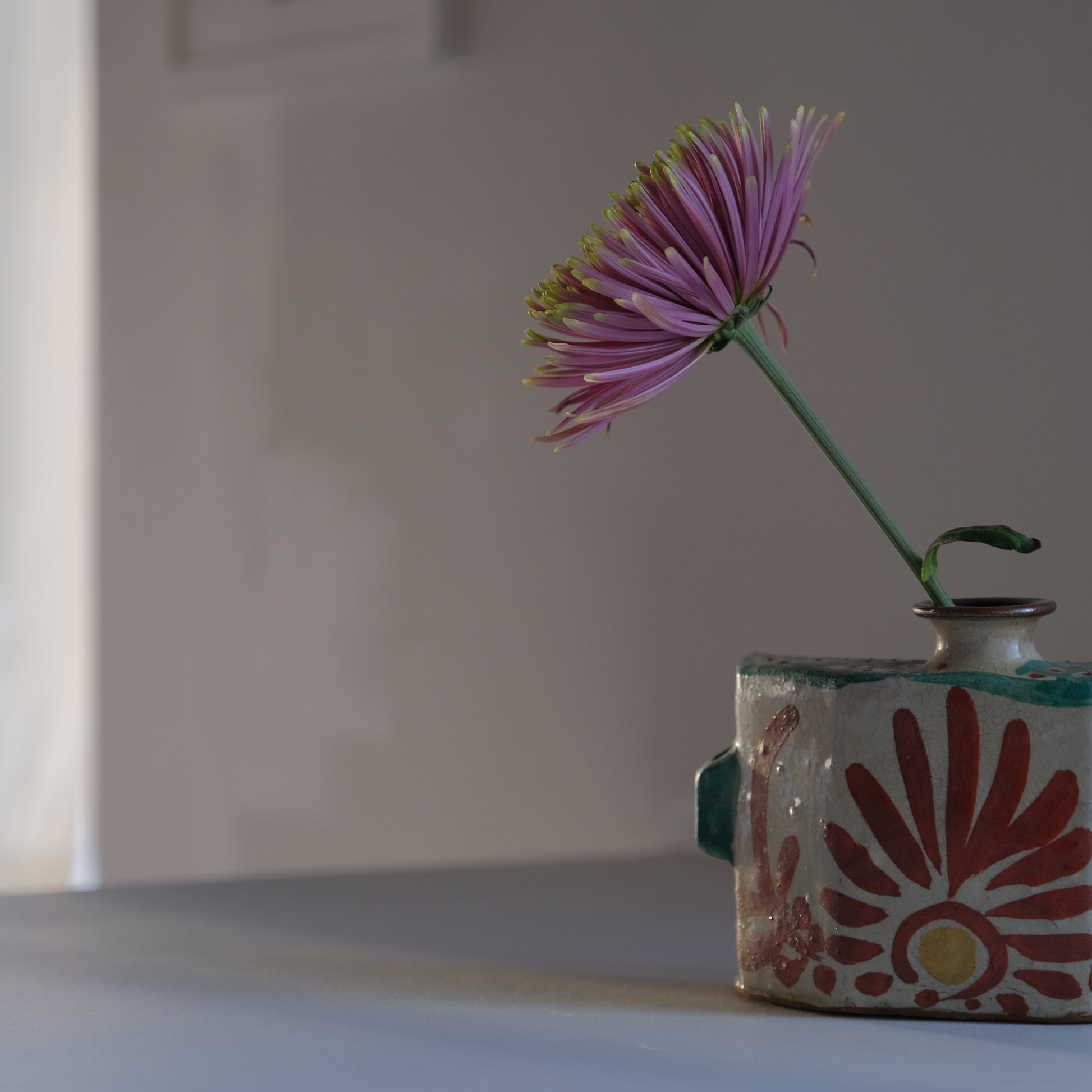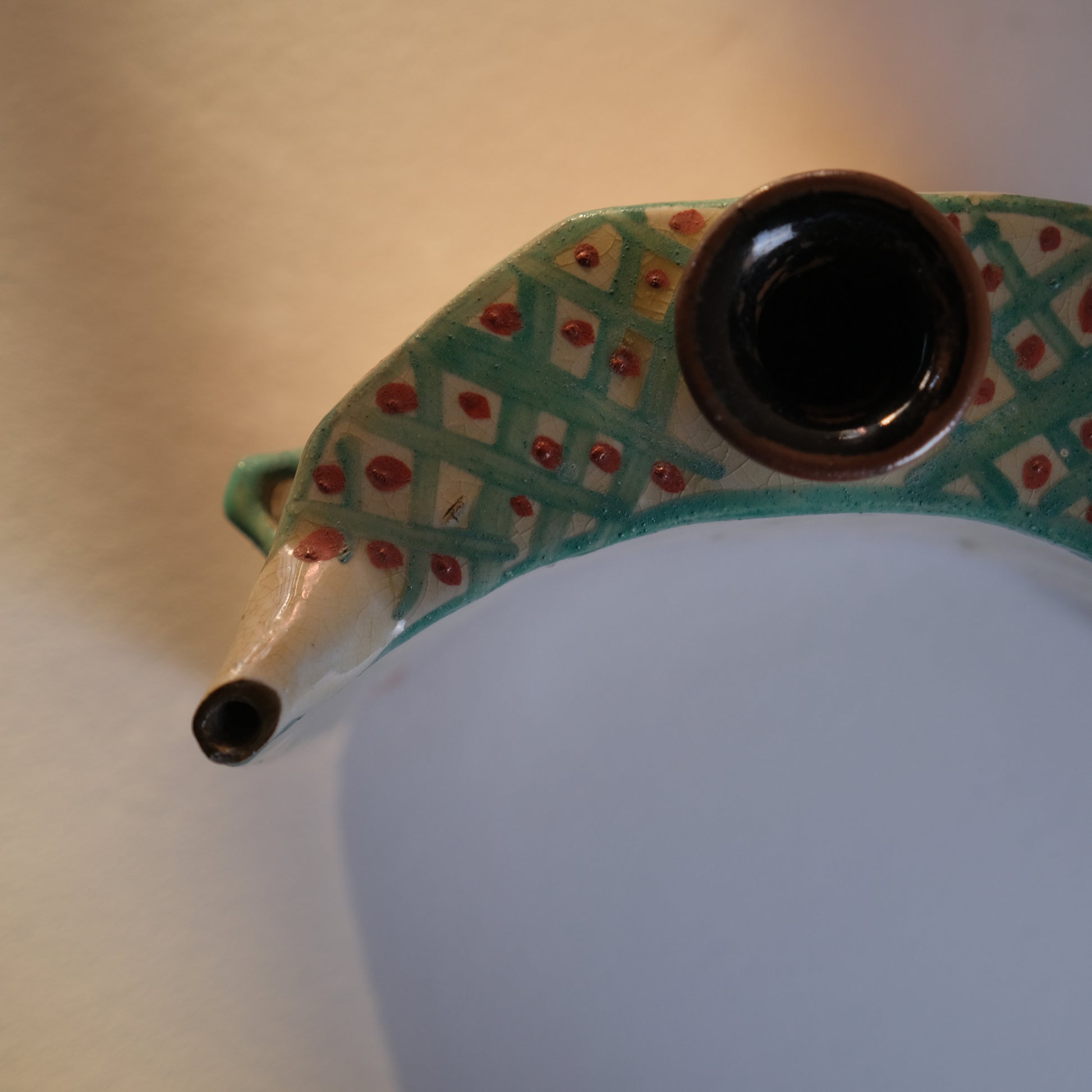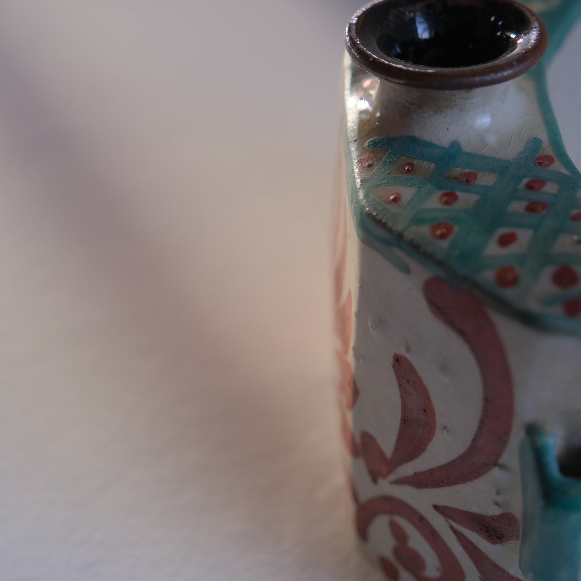 壺屋焼仁王窯の古い抱瓶。紐を通し腰に掛けて持ち運ぶ水筒のような道具として使われていた抱瓶ですが、鑑賞用やインテリアに取り入れて花器としても存在感を放ってくれそうです。沖縄の焼き物は元々現在の那覇市壺屋地区にて盛んに作られていました。大正から昭和にかけ民藝運動により本土でも広く認知され、金城次郎をはじめ数々の名工達も生まれていきますが、1970年以降市街地であった壺屋地区で薪窯による焼き物づくりが規制され現在に続く読谷村で焼き物がつくられるようになっていきます。