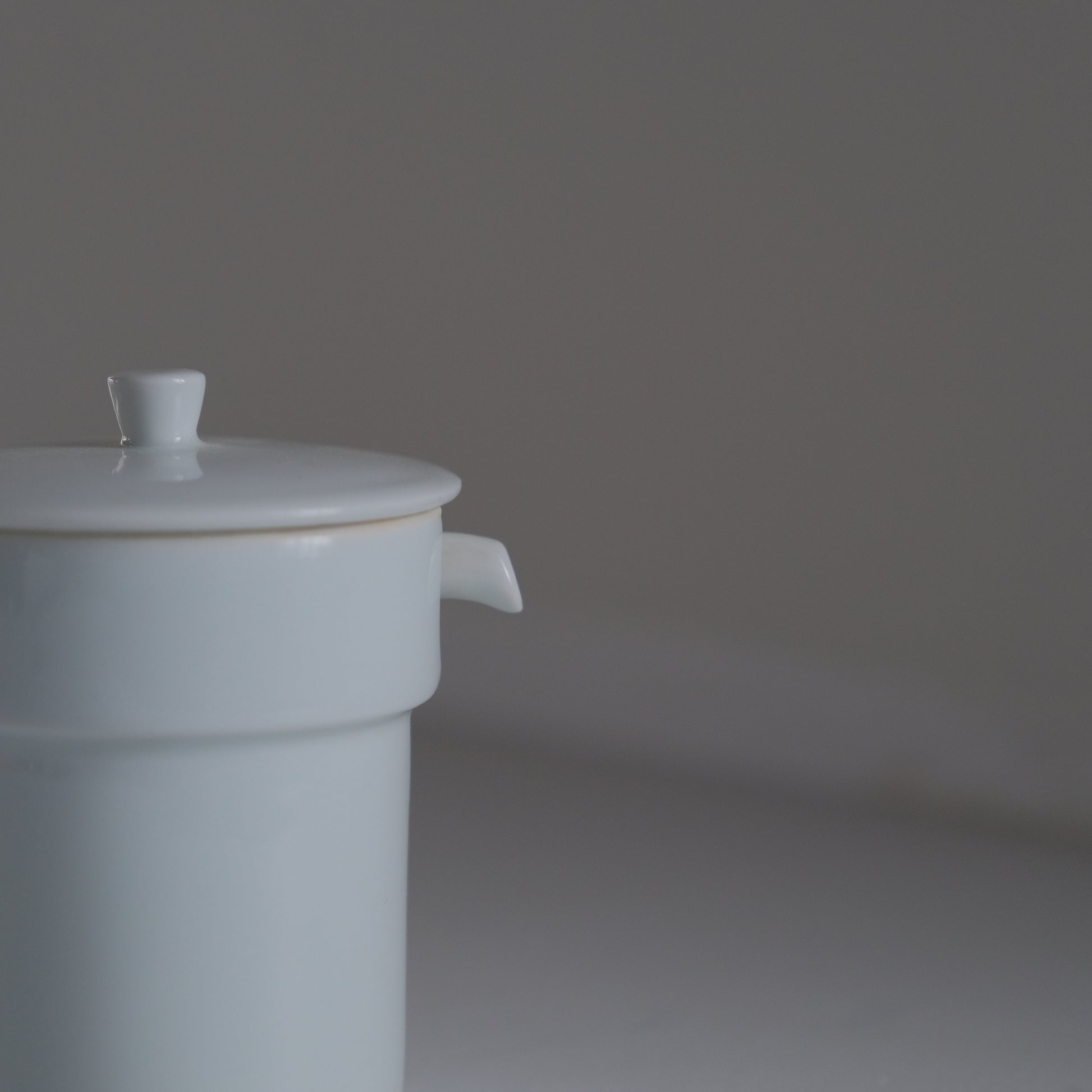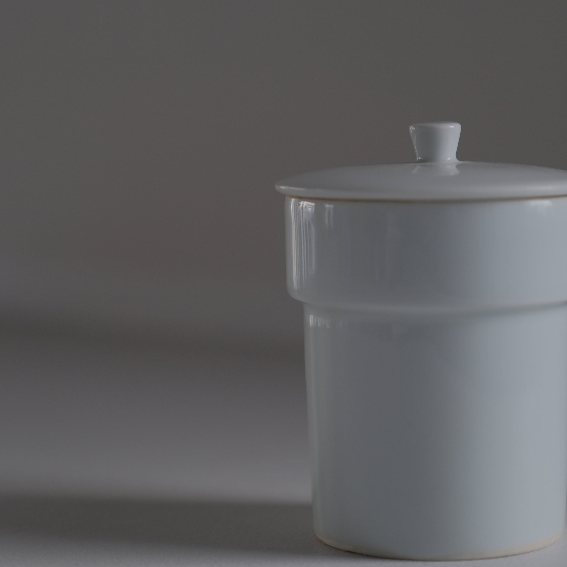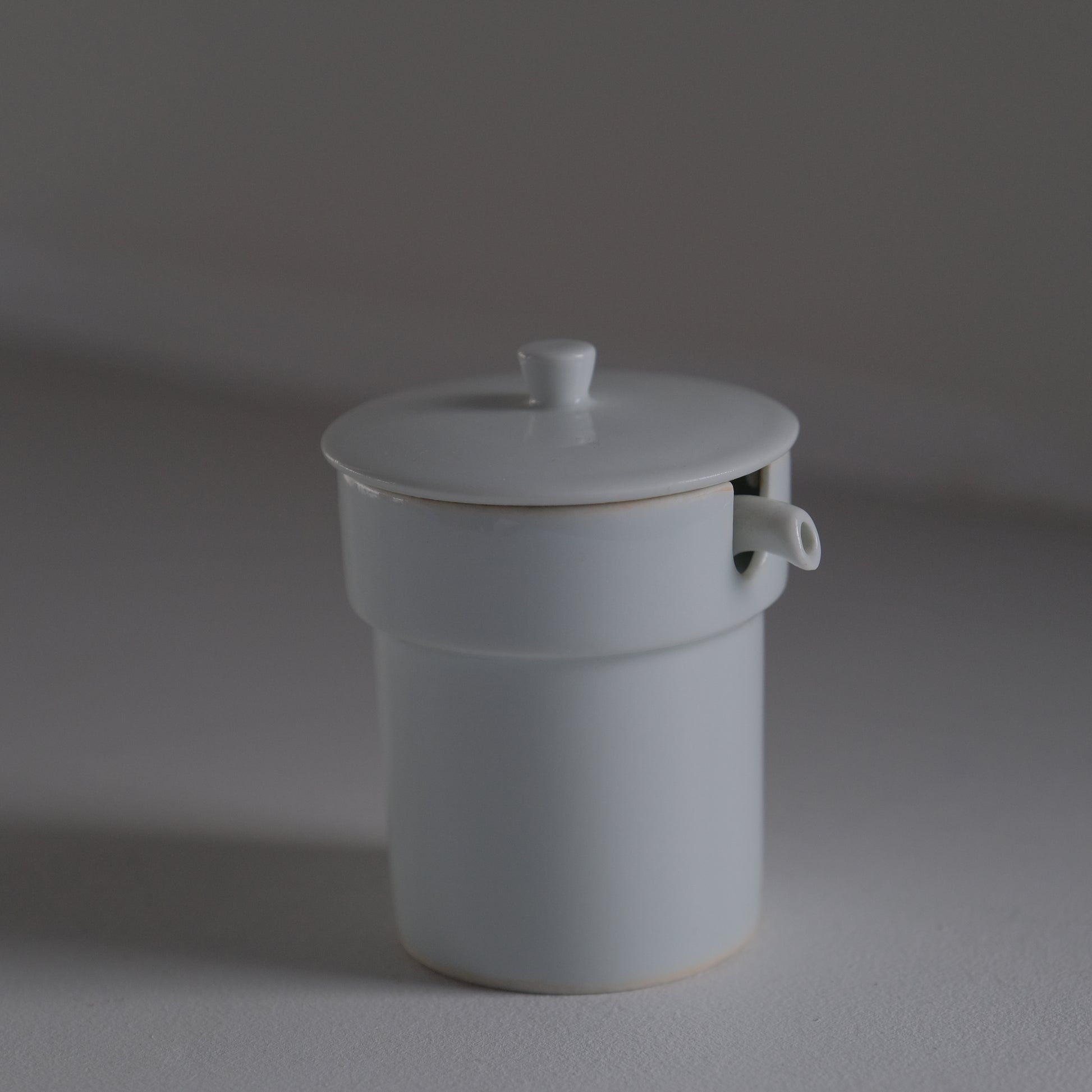 特徴的な形状の白磁のソース瓶。安定感の良い底面と持ちやすいくびれのある形状、蓋を開けると調味液を補充しやすい口があり、機能性がありながらも可愛らしくモダンさもあるデザイン。食卓にそっと置いておきたいアイテムです。