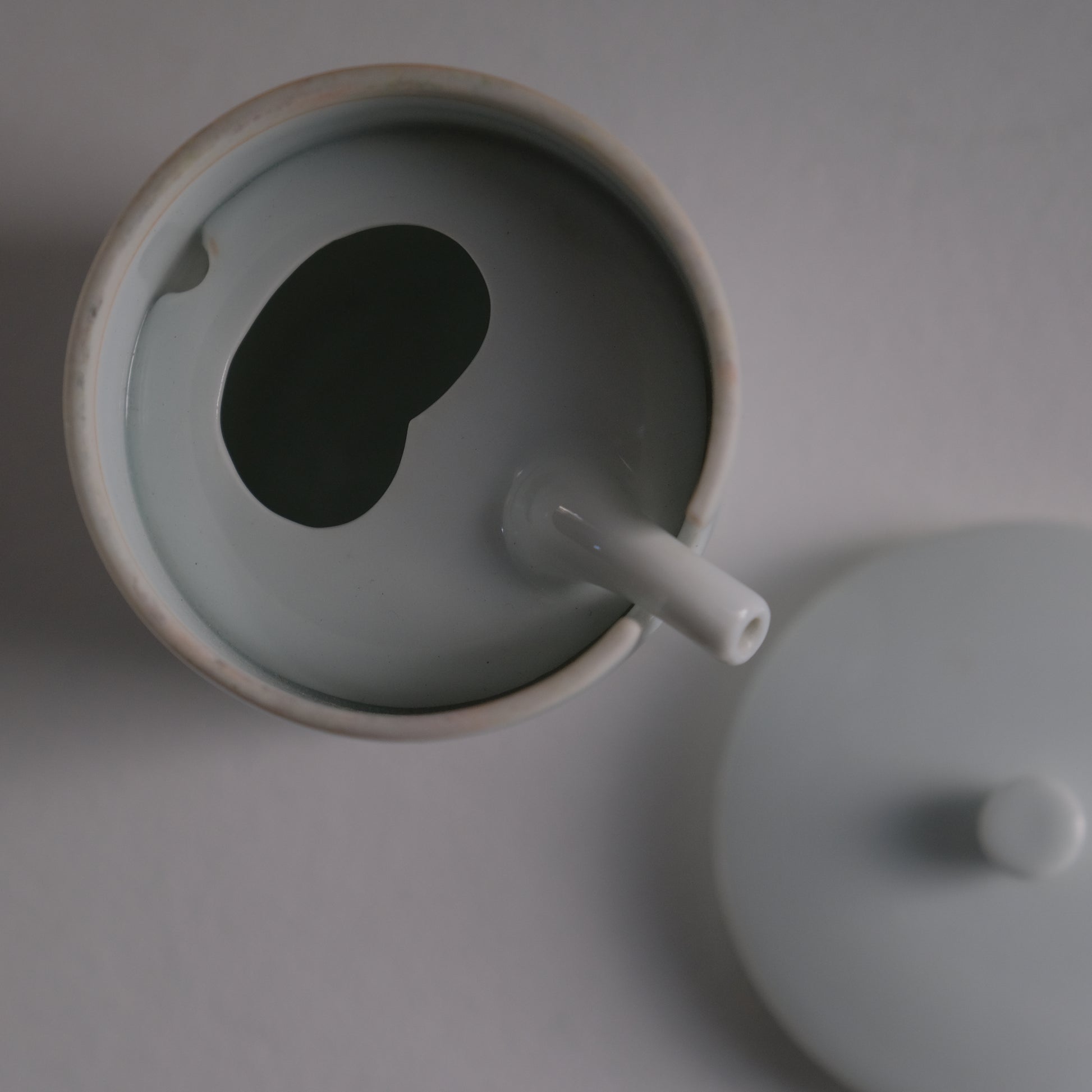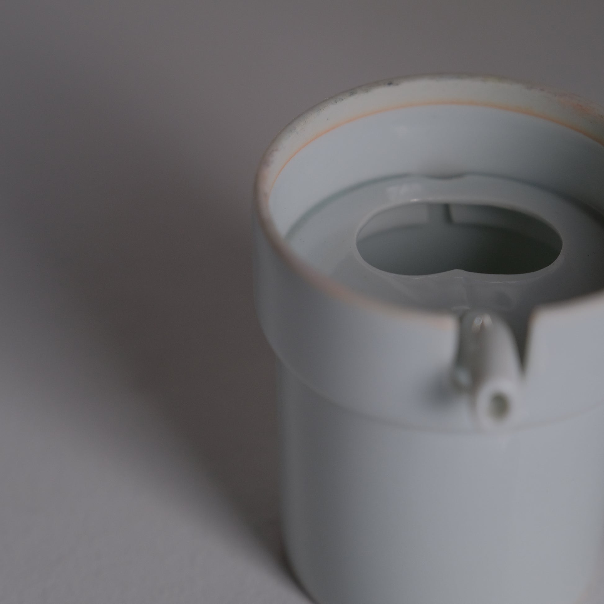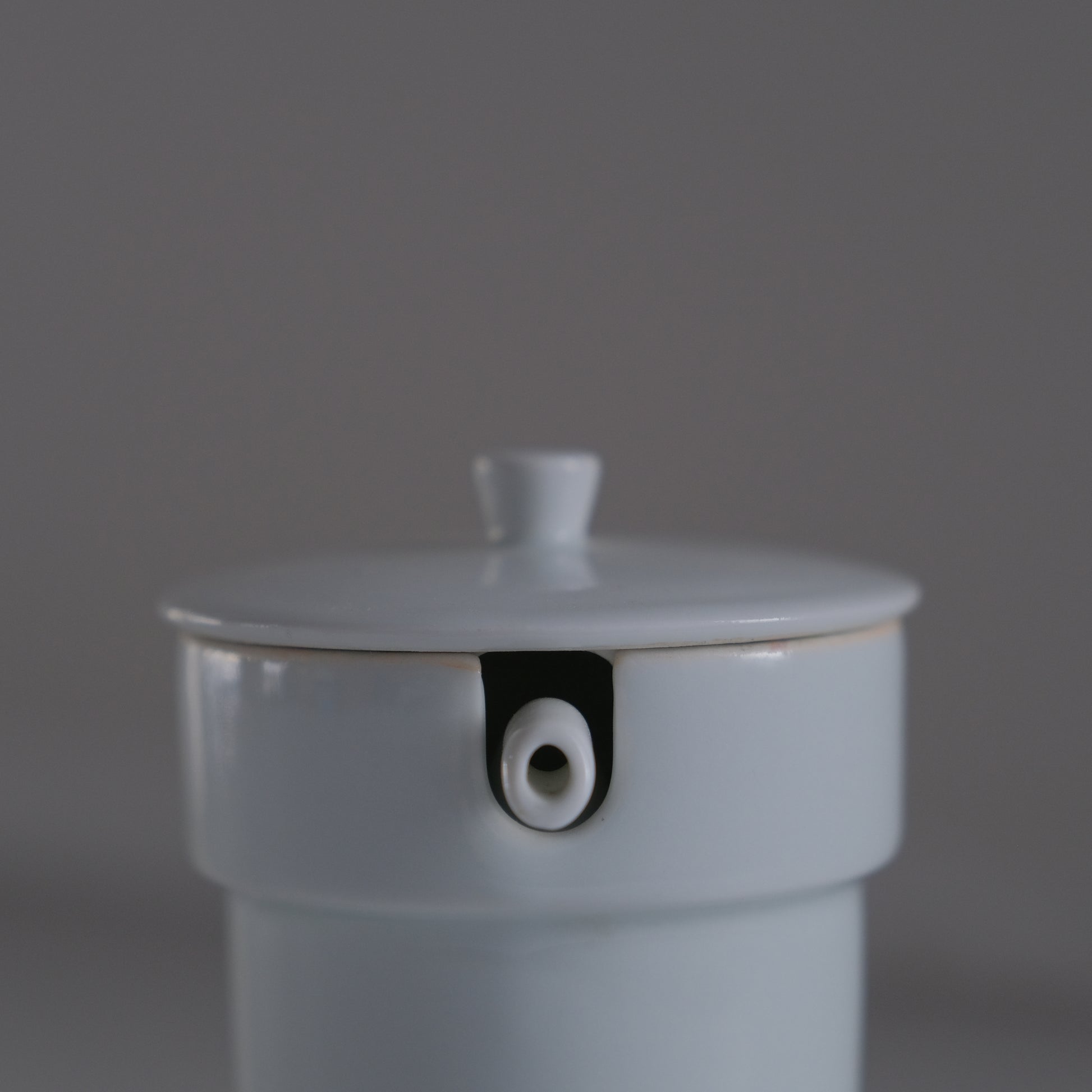 特徴的な形状の白磁のソース瓶。安定感の良い底面と持ちやすいくびれのある形状、蓋を開けると調味液を補充しやすい口があり、機能性がありながらも可愛らしくモダンさもあるデザイン。食卓にそっと置いておきたいアイテムです。