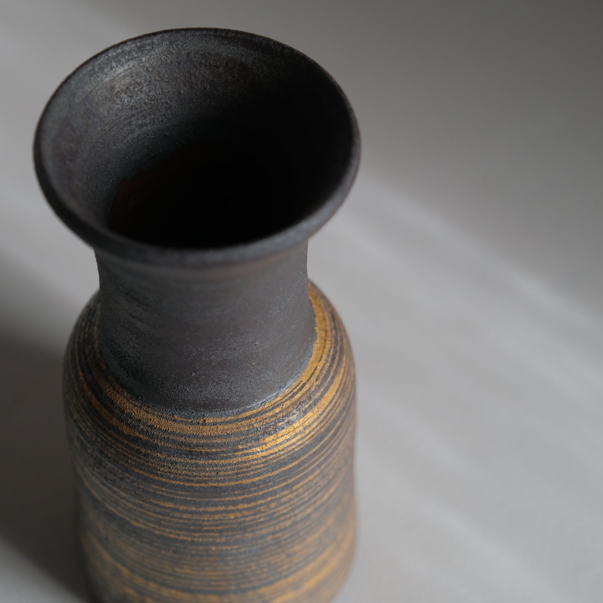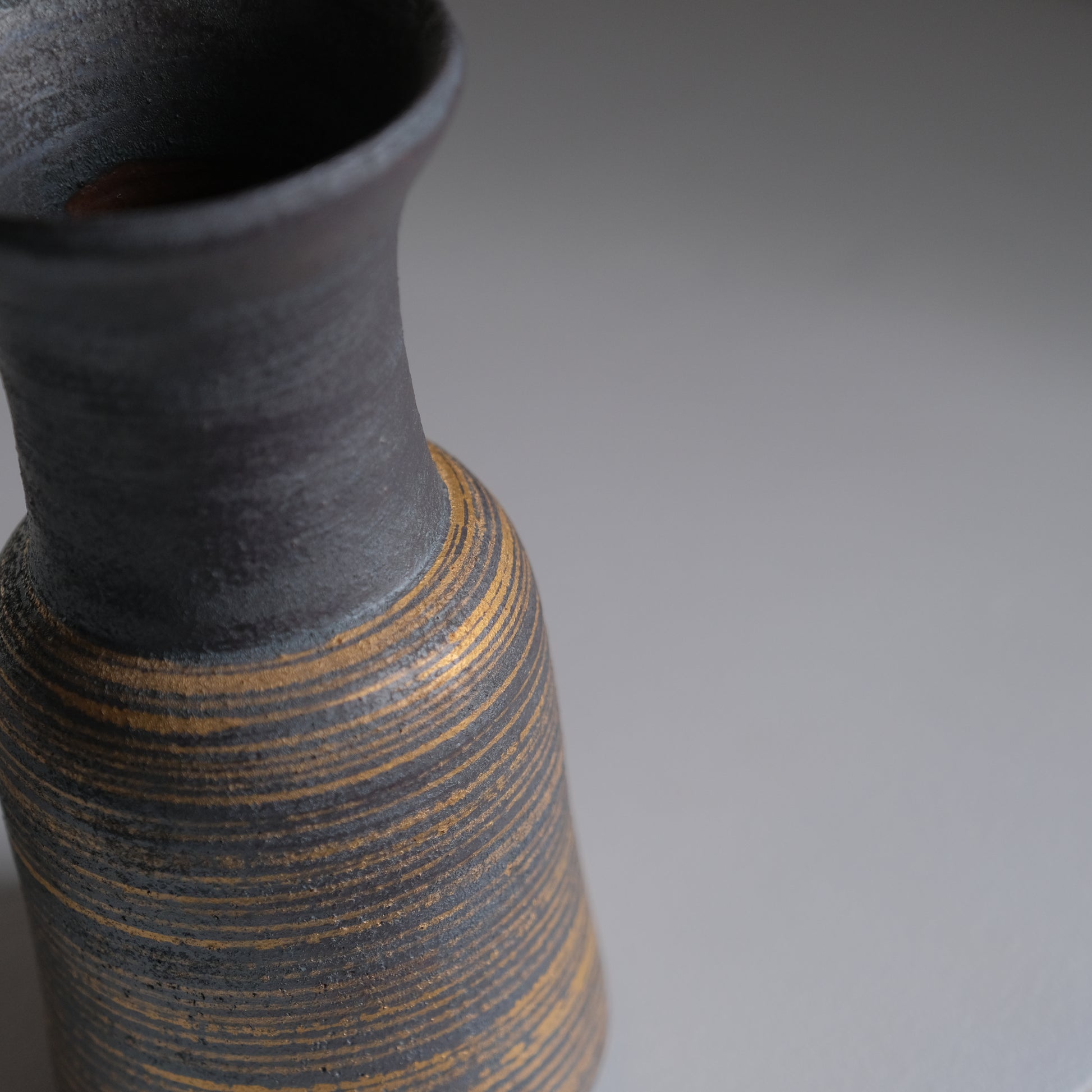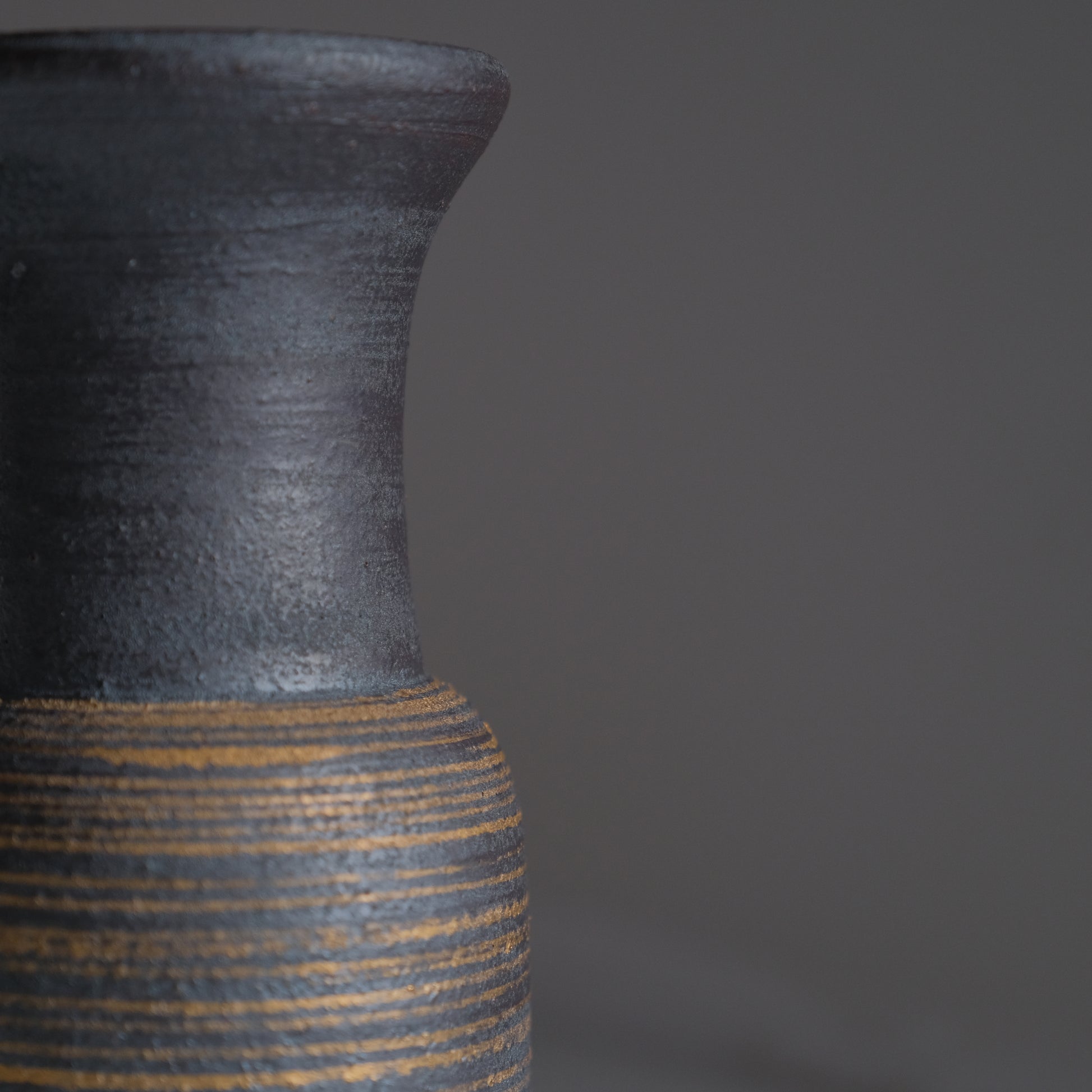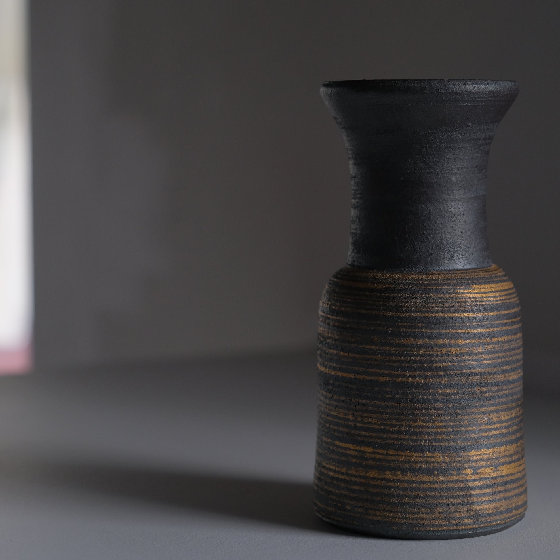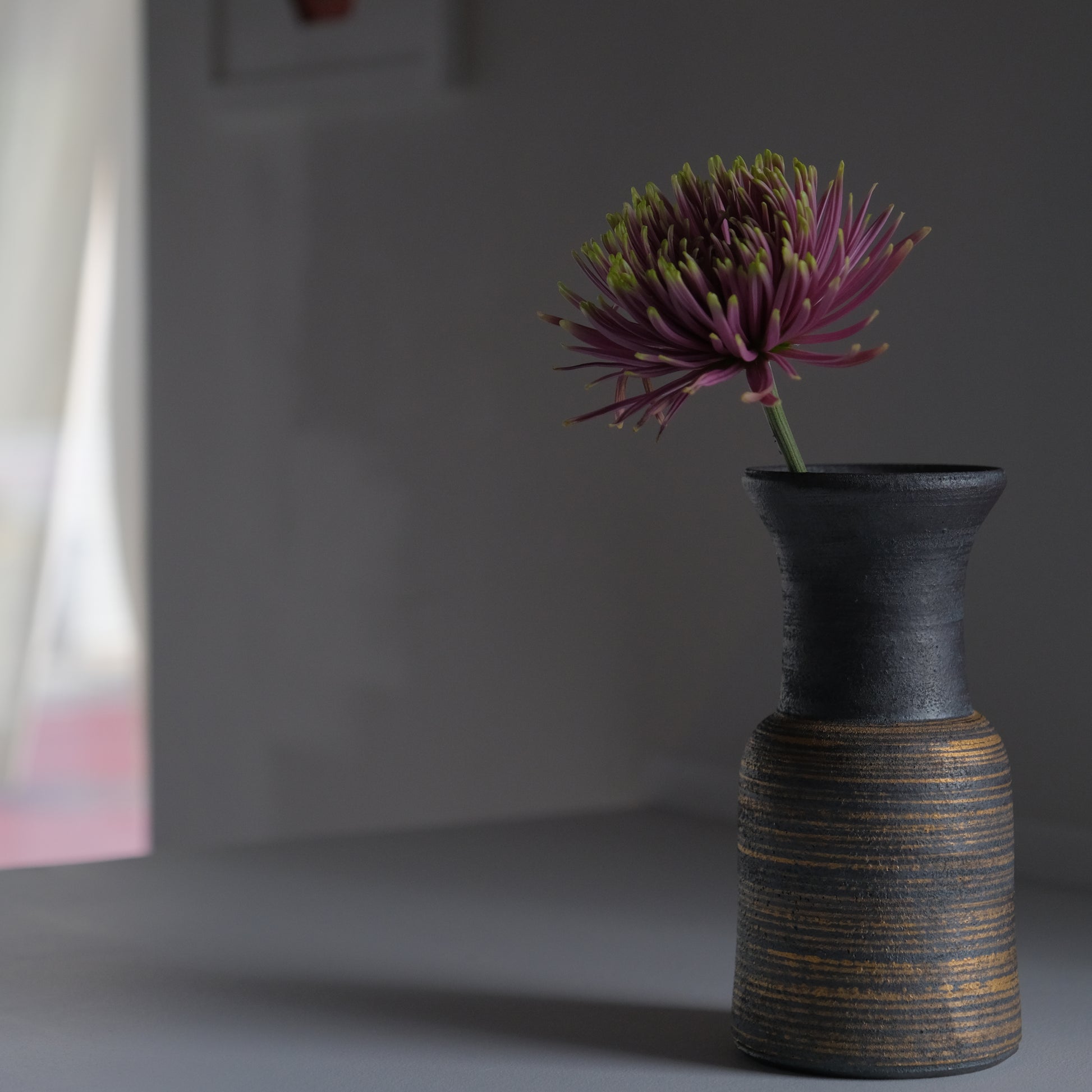 マットな質感の黒肌と細いラインの金彩のバランスが絶妙でセンスの高さがうかがえるシックな作品。実際に花を生けても主役の花とのコントラストがとても美しく和花、洋花問わず受け止めてくれる万能さを感じます。
