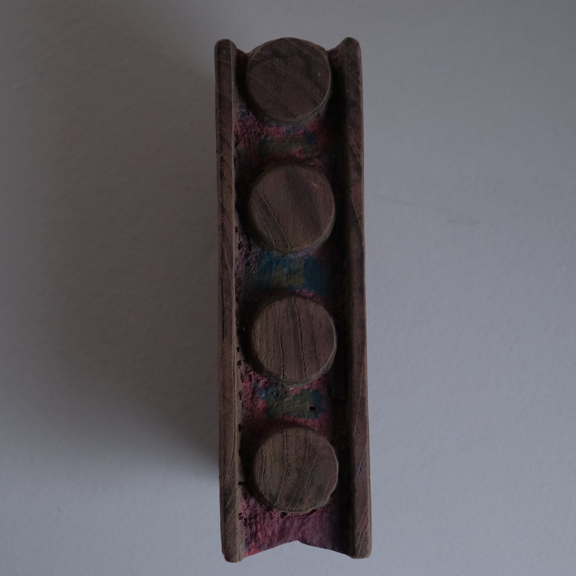 インドの伝統的な工芸であるブロックプリントに使用されていた古い手彫りの版木です。版木を布に押し当てそれを繰り返すことで連続した模様を生み出すインドの原始的なテキスタイル技法は驚くべきことに16世紀頃からほとんど変わらず現代まで続いており、その手仕事によって生まれる布はおおらかな手仕事の魅力に溢れています。