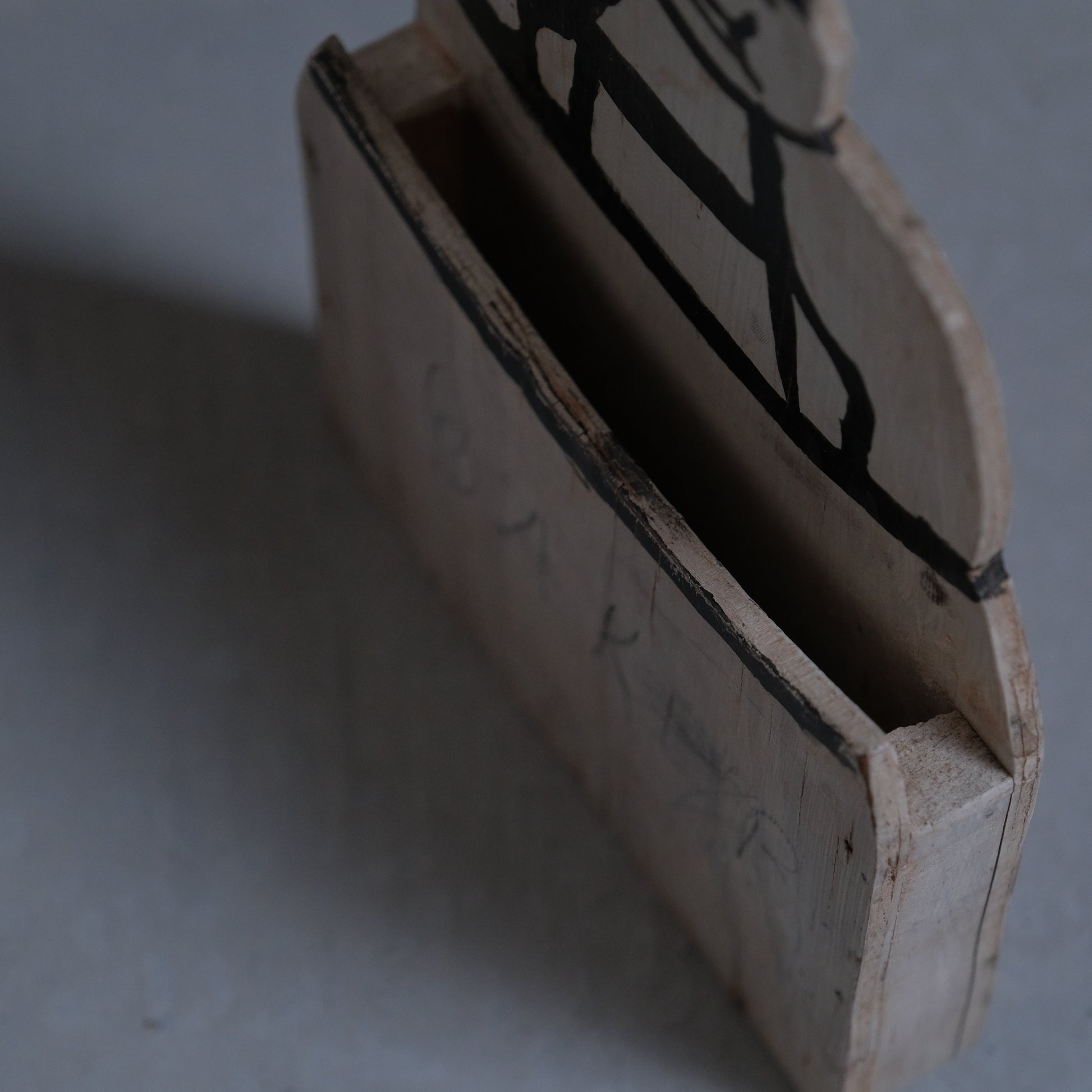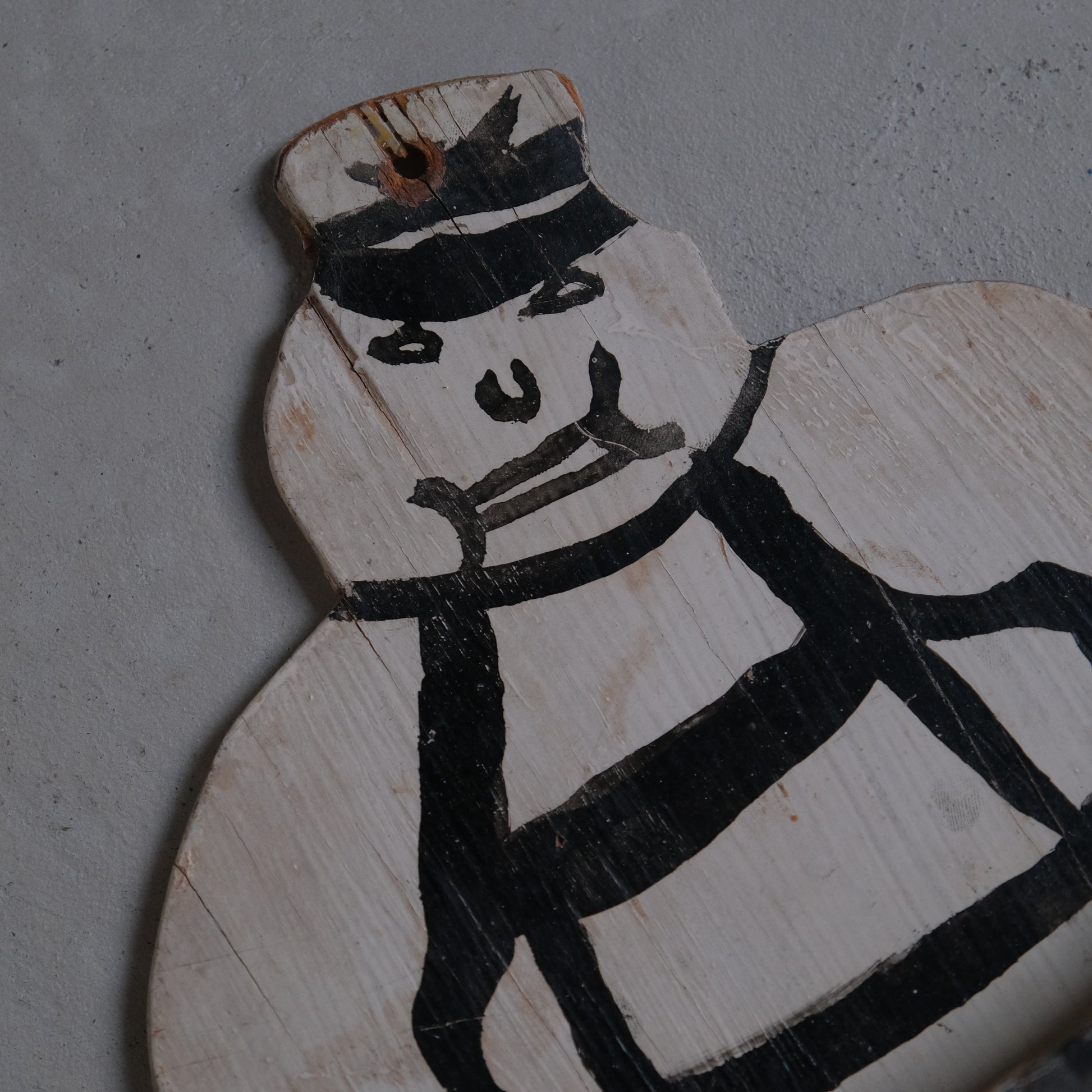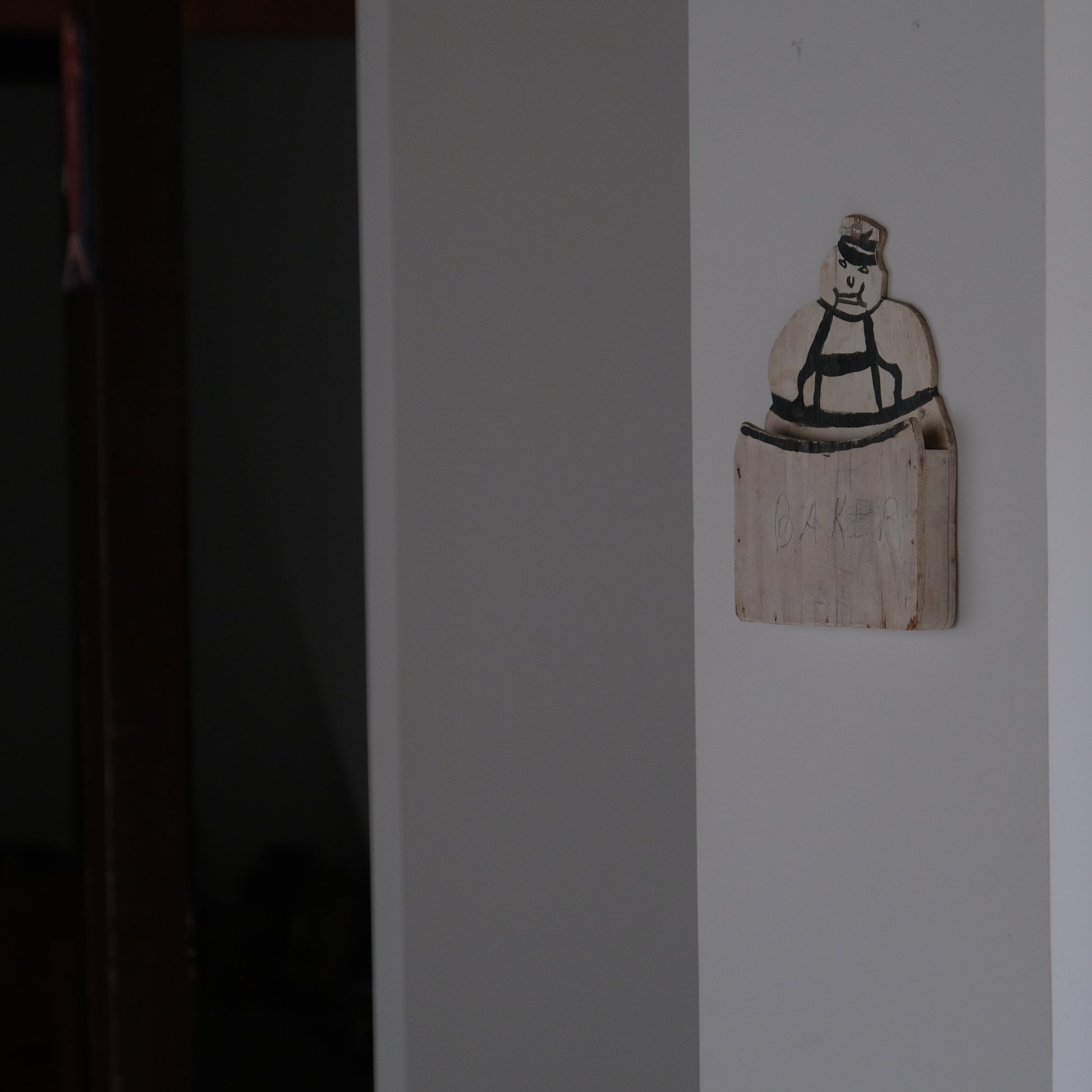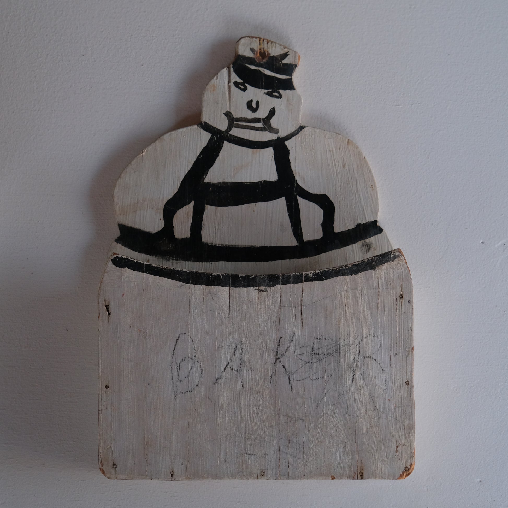 うっすらと”BAKER"という文字が確認できます。こちらはおそらく昔町のパン屋さんで使われていたものと思われますがなんとも言えず愛嬌がありその作為のない純粋無垢な佇まいが魅力的。このモチーフとなっているパン屋の店主と思しきふてぶてしい表情の彼をMr.Bakerと名付けました。当時誰かがMr.Bakerのために作り送ったものか自作したものか詳細は不明ですがそこにはさまざまな物語が連想されます。レターホルダーとして日々届くお知らせや領収書などの紙モノを入れておくインテリアとしていかがでしょうか。