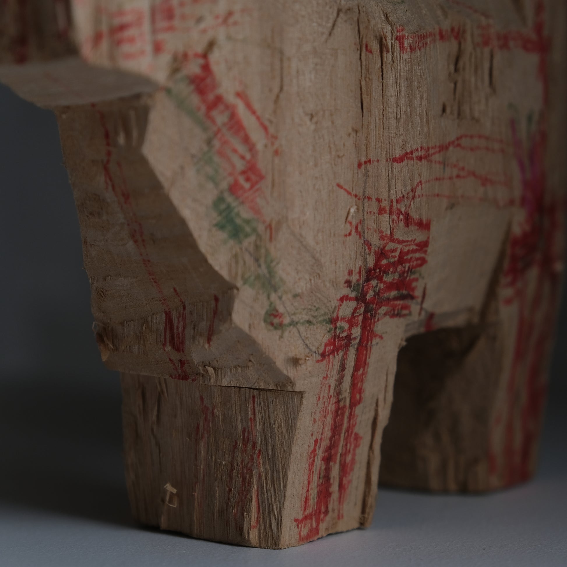 この洗練や完成度とは別の場所で成立している魅力的な造形は、意図して作られたのモノではないのではないでしょうか。なんらかの理由で完成まで至らず、作者の目線で見ると作業途中の状態に思えます。また、描かれている線も模様というよりは何かを確かめる目的のようなものを感じます。この絶妙なバランスの工程で止まった偶然性は奇跡的で、これはそこに第三者の視点が加わり生み出されたとオブジェ作品とも言えます。